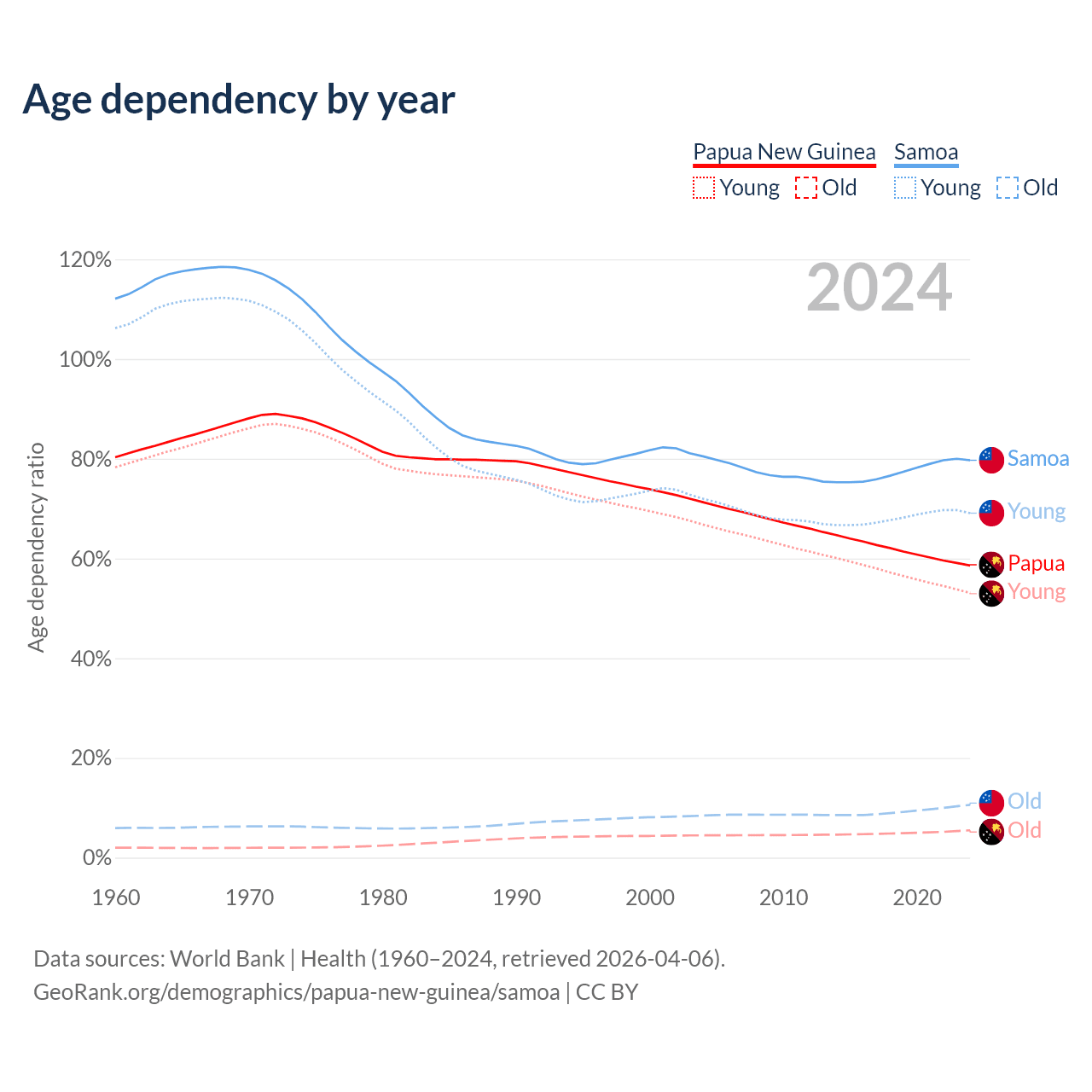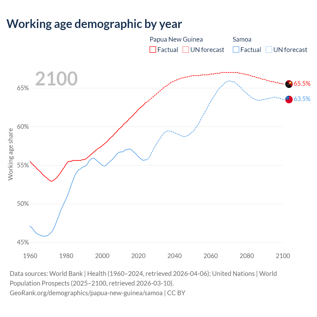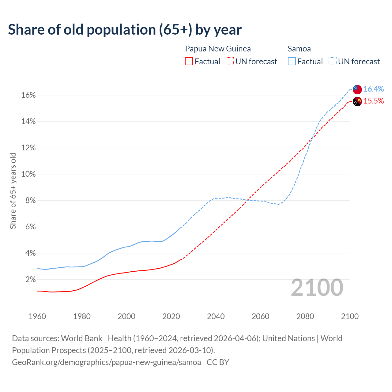 The share of older people aged 65 and over is 3.46% in Papua New Guinea and 5.88% in Samoa. Life expectancy in Papua New Guinea compared to Samoa .
