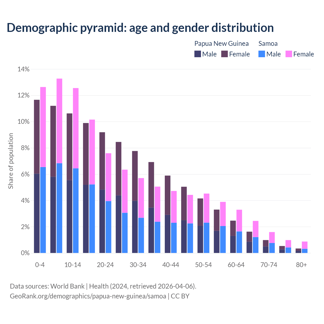 - The share of young demographic (0-15 years old) in Papua New Guinea is 33.5% vs 38.5% in Samoa.