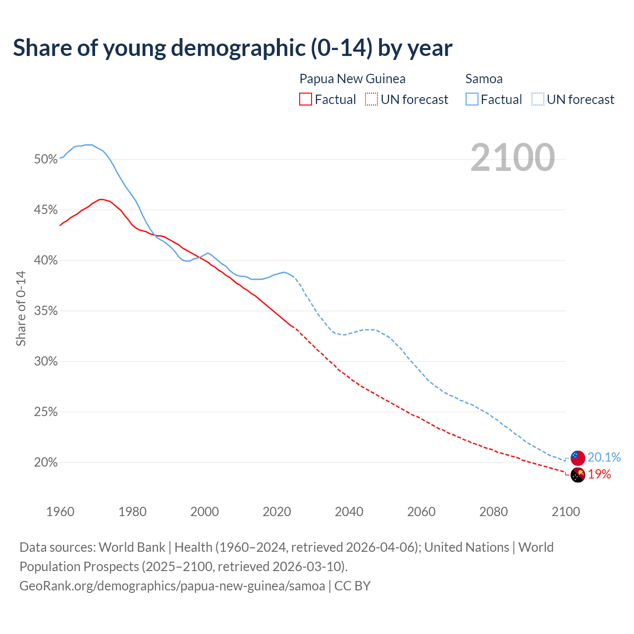 Median age Papua New Guinea vs Samoa, 1960-2100