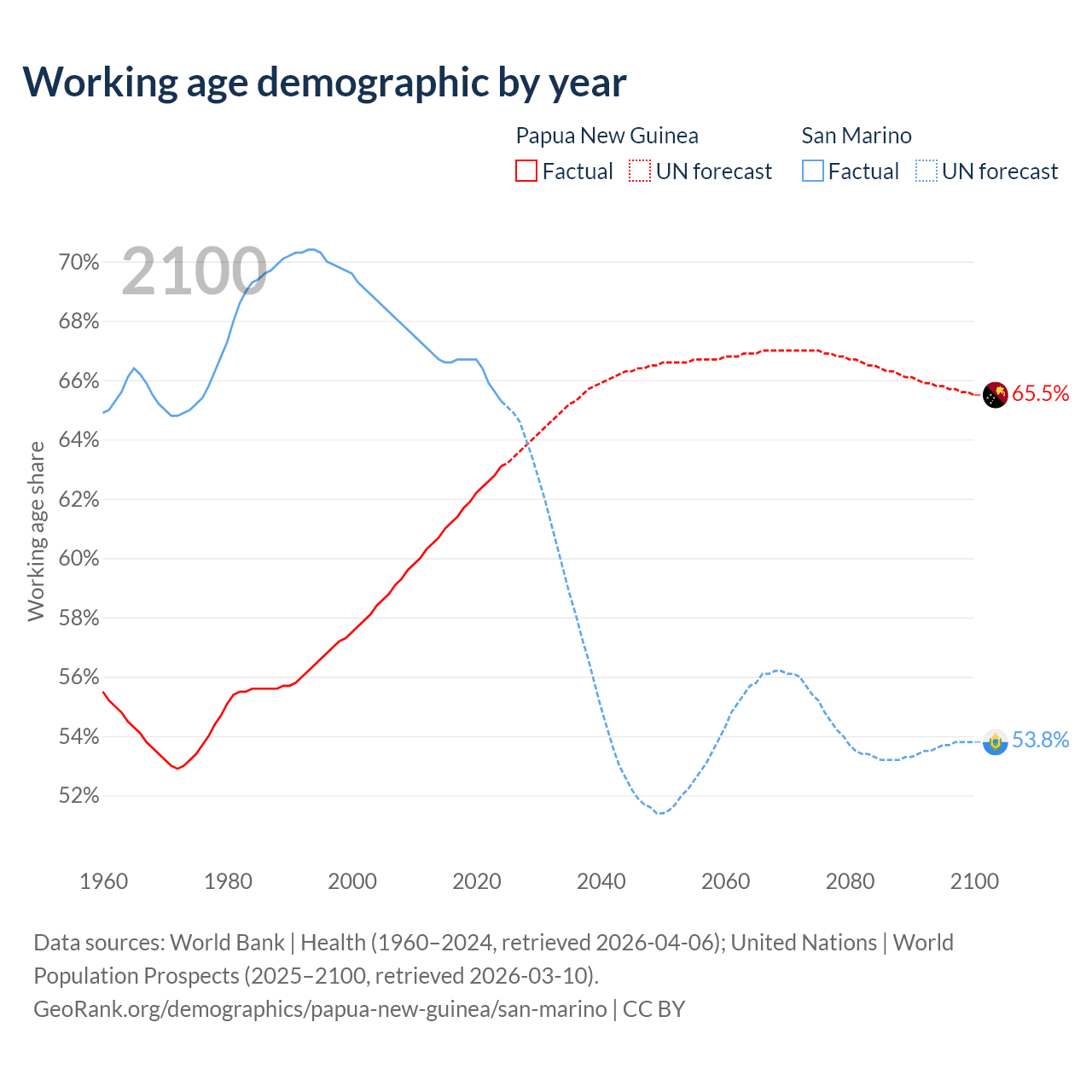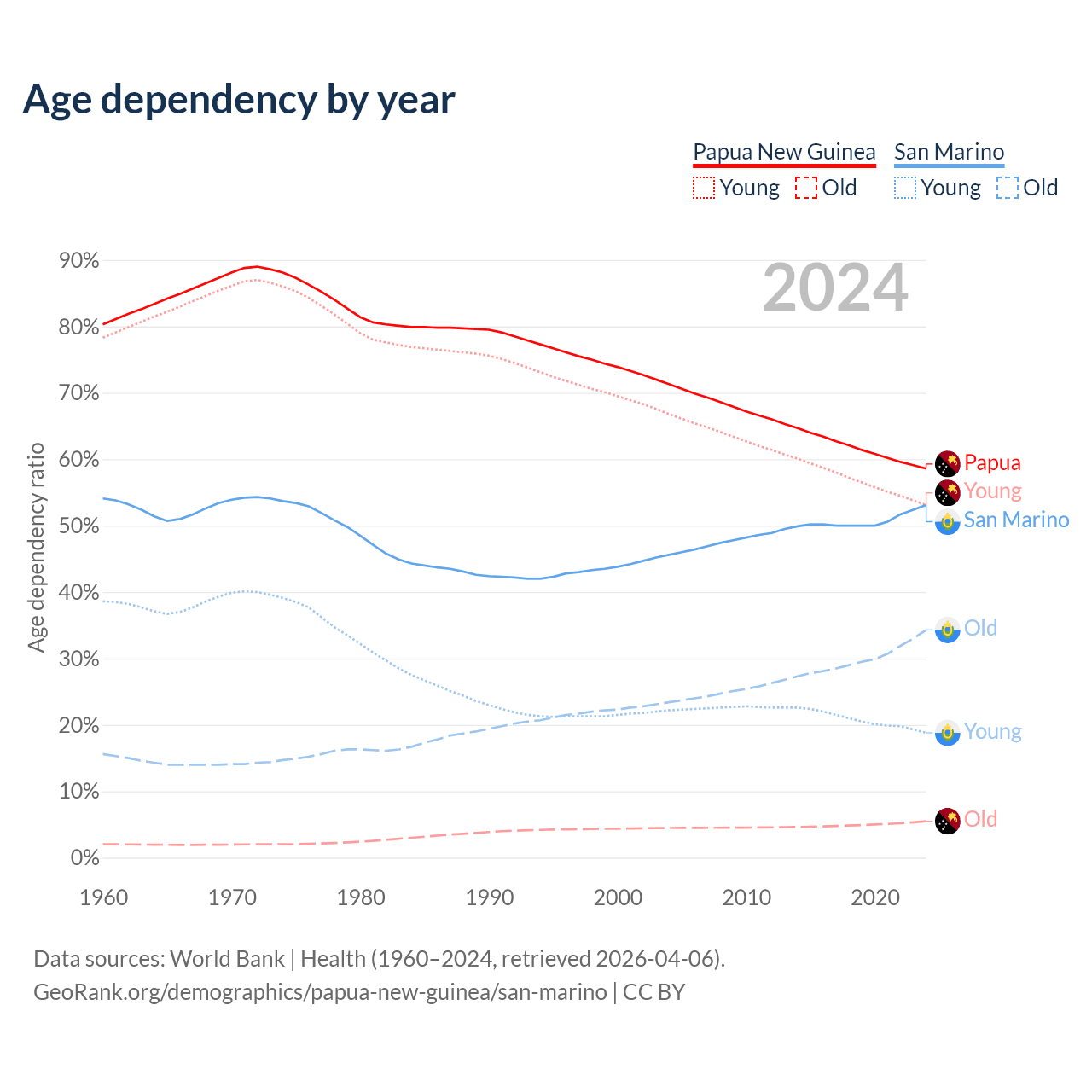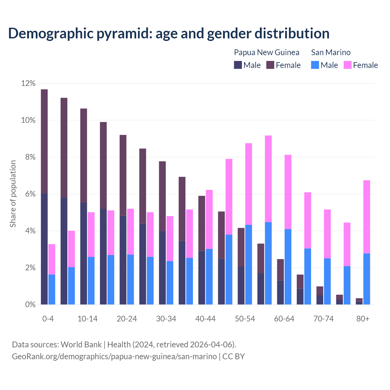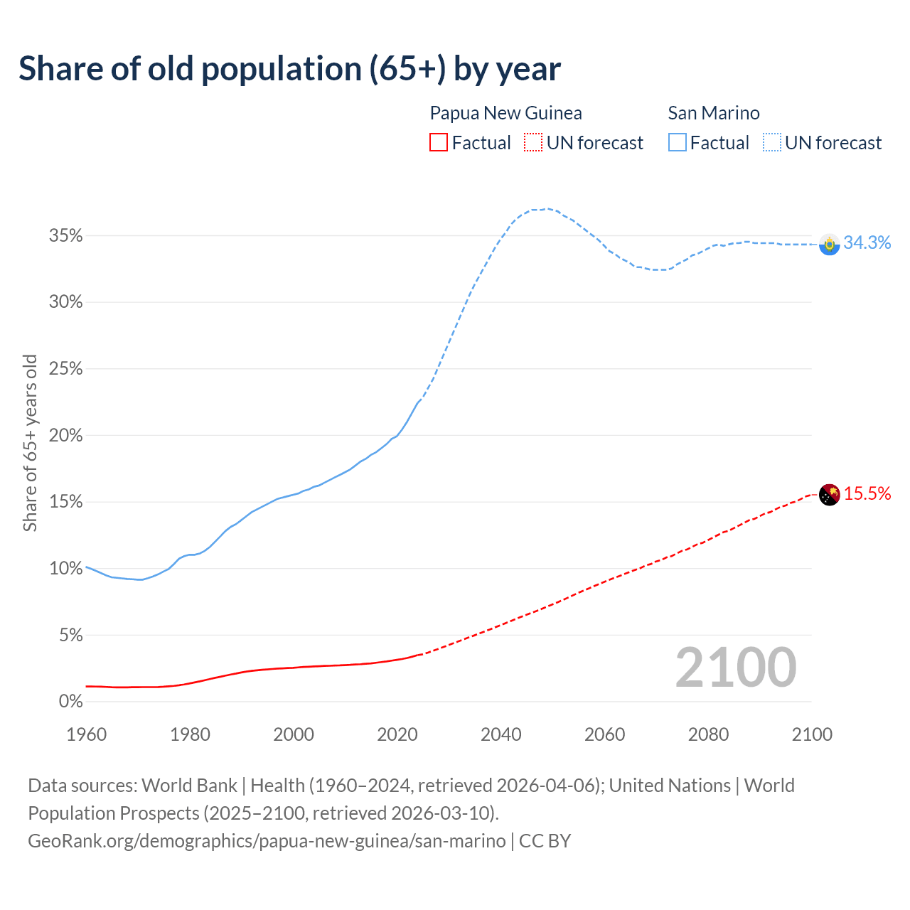 - The share of old-age demographic (65+) in Papua New Guinea is 3.46% vs 22.4% in San Marino.