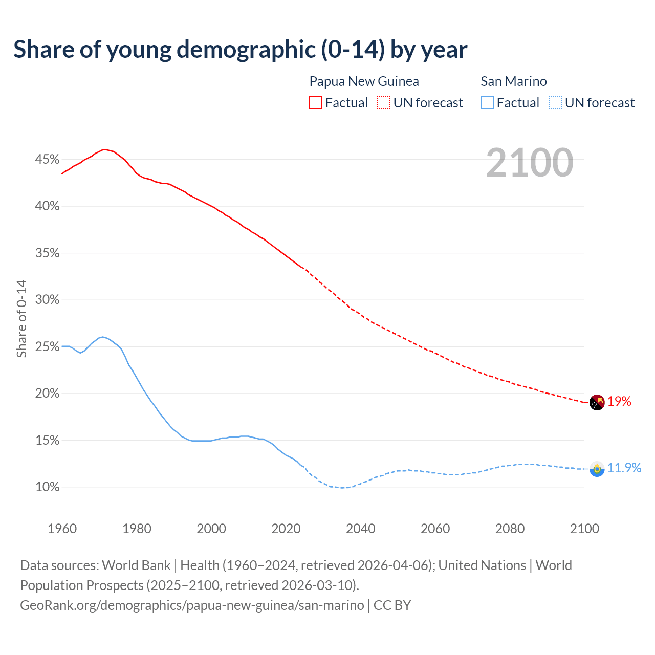 - The share of young demographic (0-15 years old) in Papua New Guinea is 33.5% vs 12.3% in San Marino.