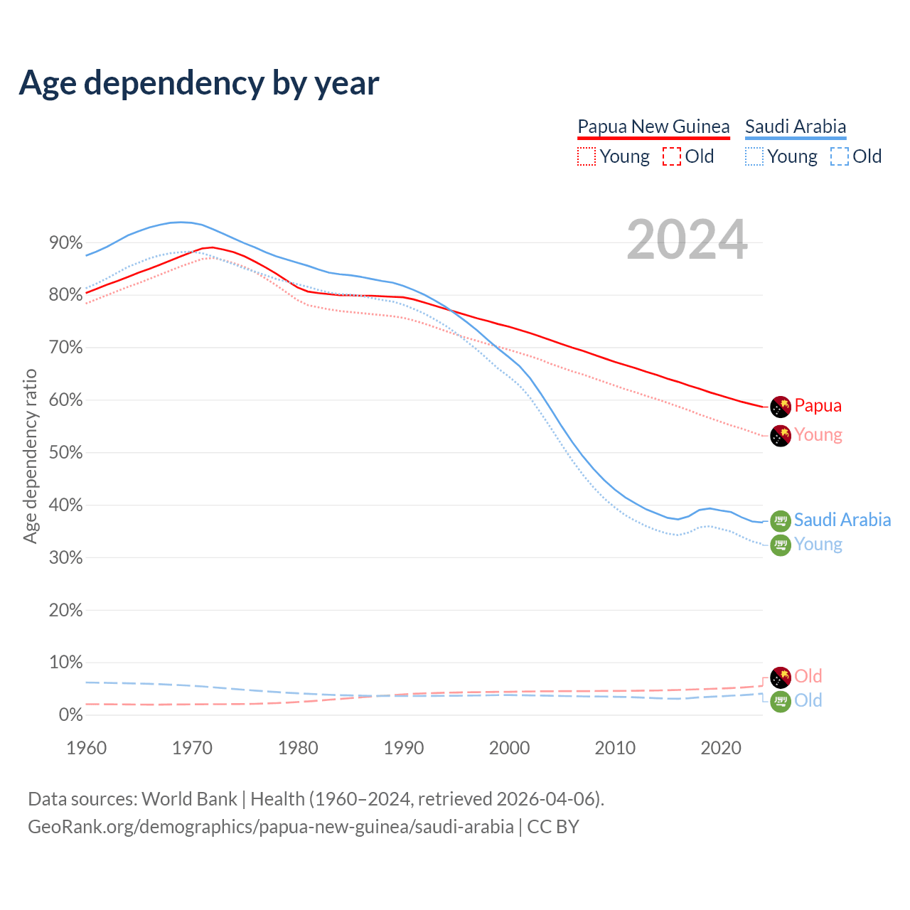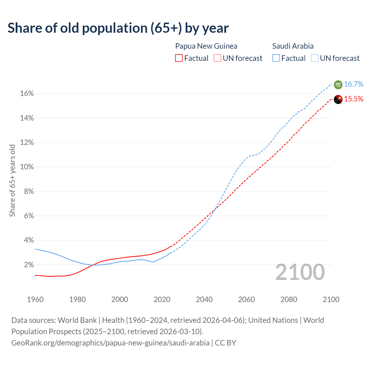 The share of older people aged 65 and over is 3.46% in Papua New Guinea and 2.95% in Saudi Arabia. Life expectancy in Papua New Guinea compared to Saudi Arabia .