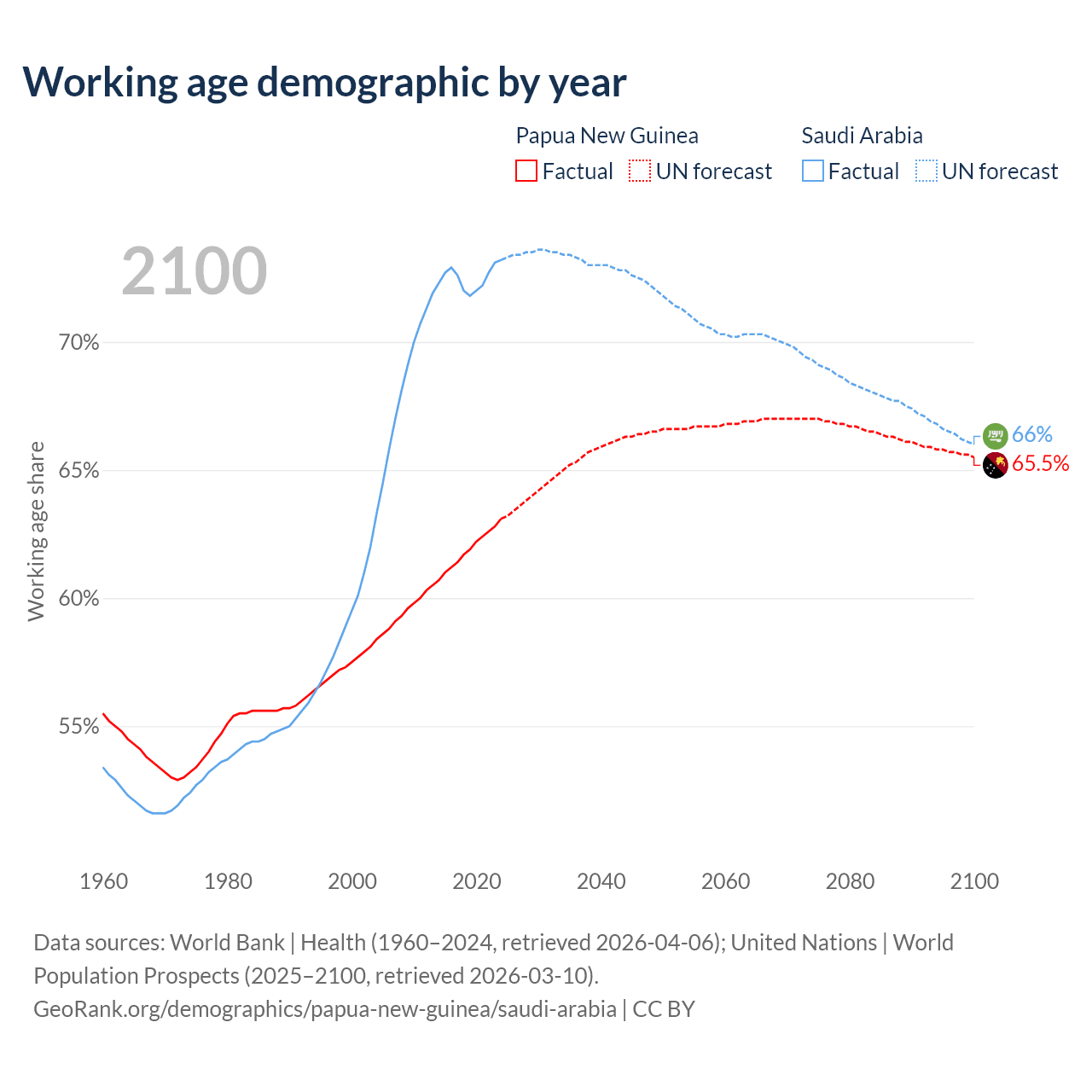 - Papua New Guinea has 6.94M working age adults (aged 15-64) vs 26.9M in Saudi Arabia.