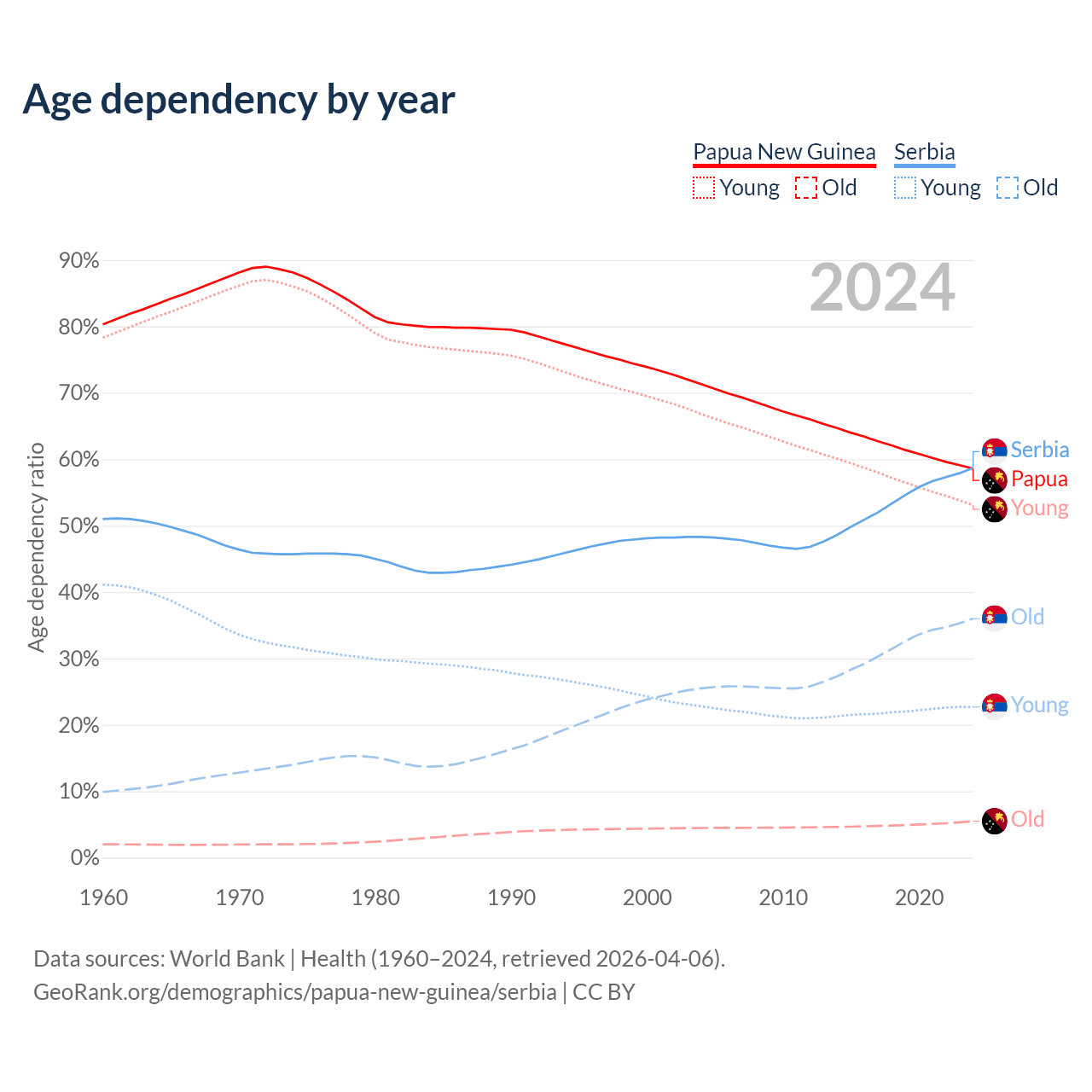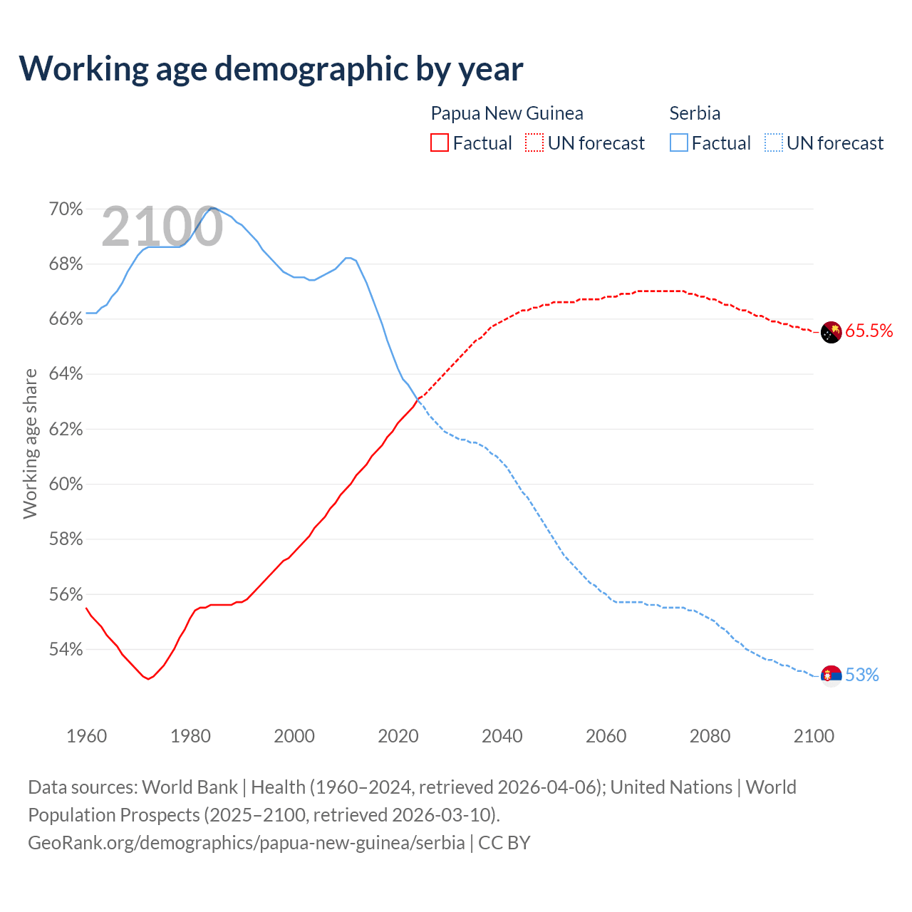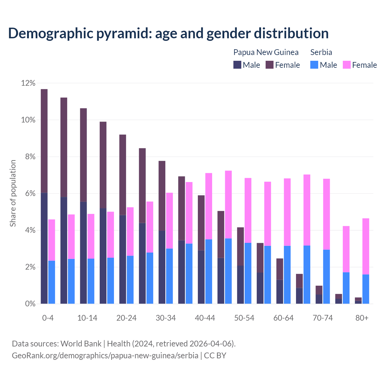The share of older people aged 65 and over is 3.46% in Papua New Guinea and 22.7% in Serbia. Life expectancy in Papua New Guinea compared to Serbia .