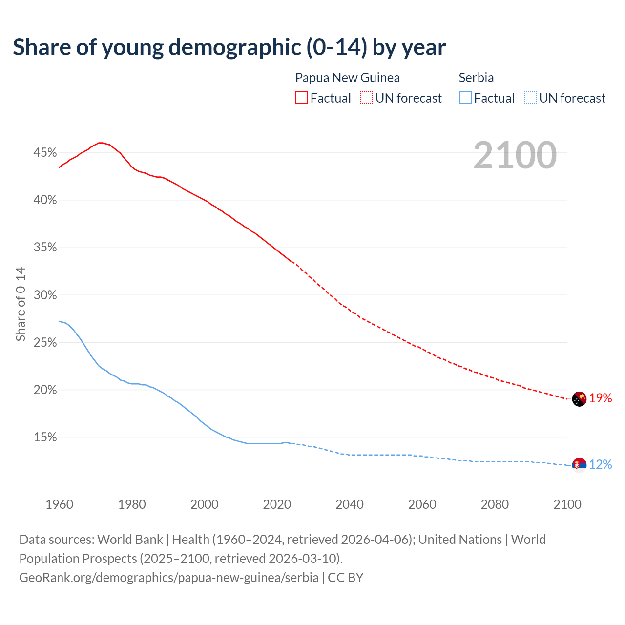 - The share of young demographic (0-15 years old) in Papua New Guinea is 33.5% vs 14.3% in Serbia.