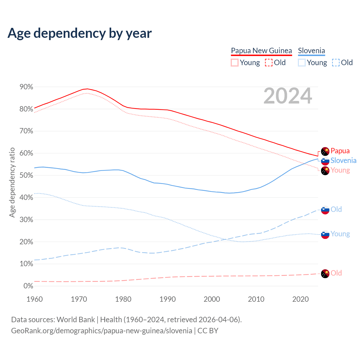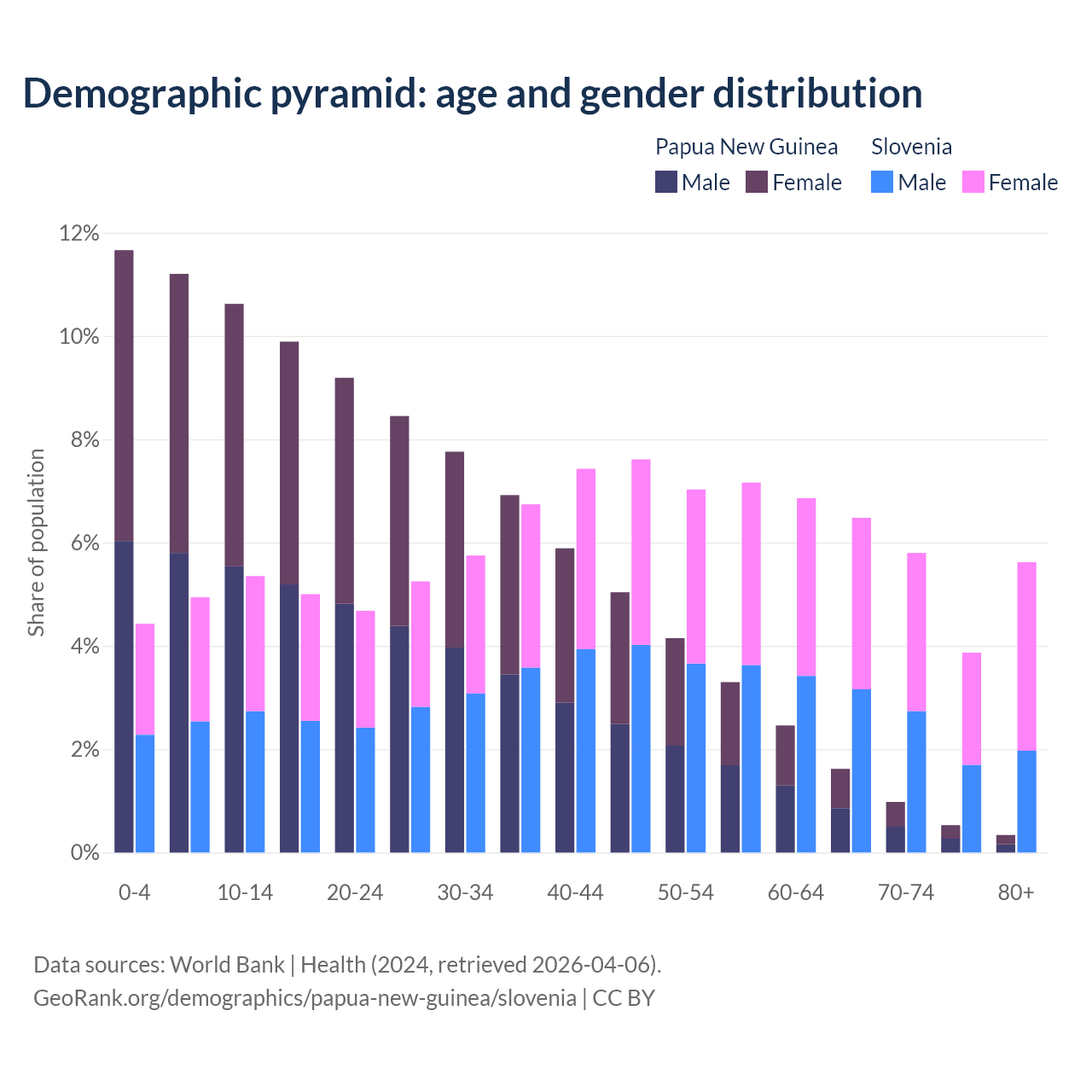 - The share of old-age demographic (65+) in Papua New Guinea is 3.46% vs 21.8% in Slovenia.