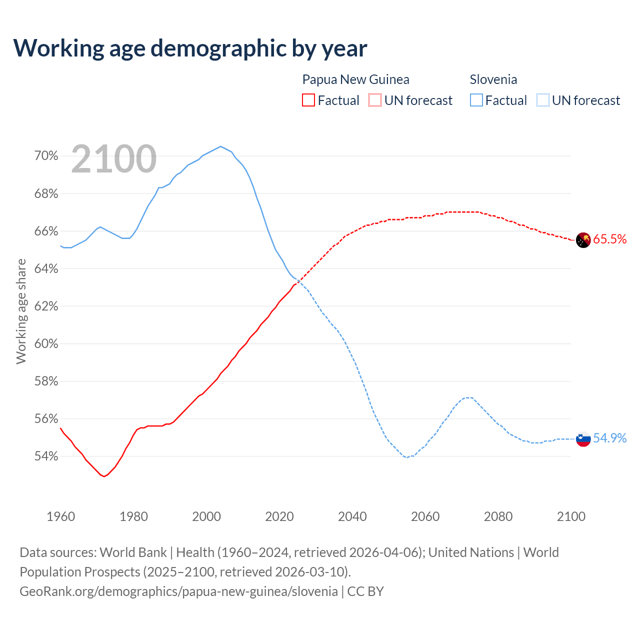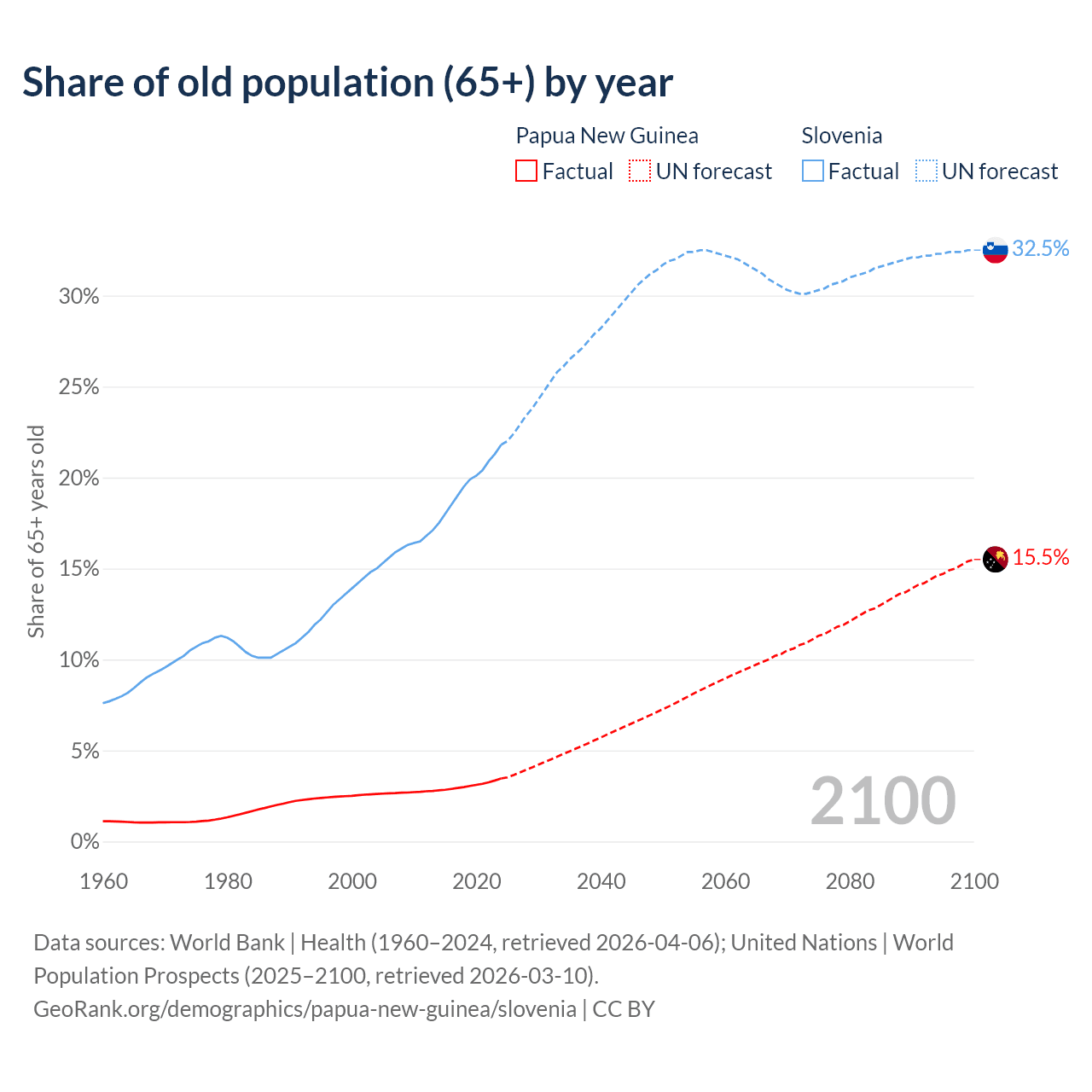 The share of older people aged 65 and over is 3.46% in Papua New Guinea and 21.8% in Slovenia. Life expectancy in Papua New Guinea compared to Slovenia .