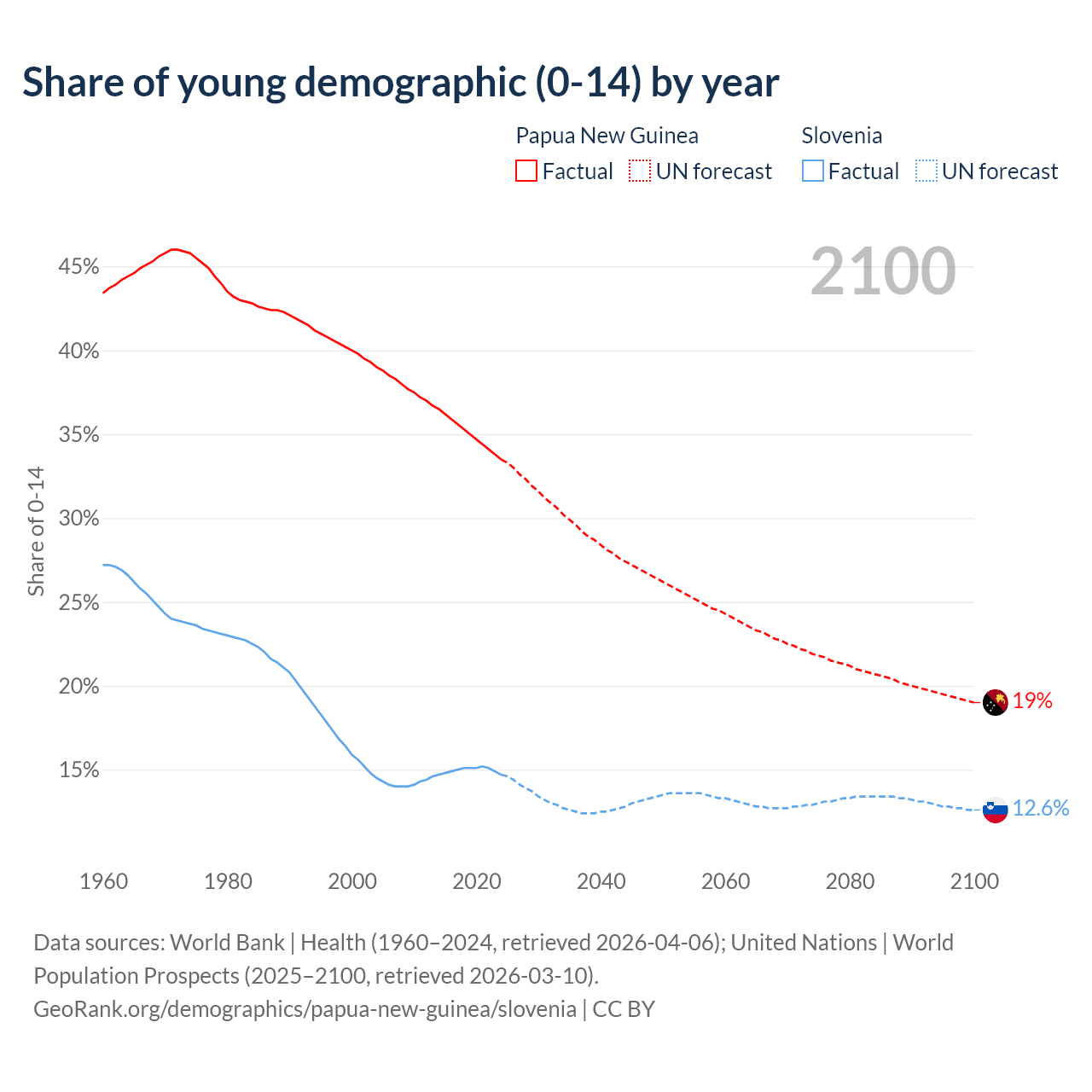 - The share of young demographic (0-15 years old) in Papua New Guinea is 33.5% vs 14.7% in Slovenia.