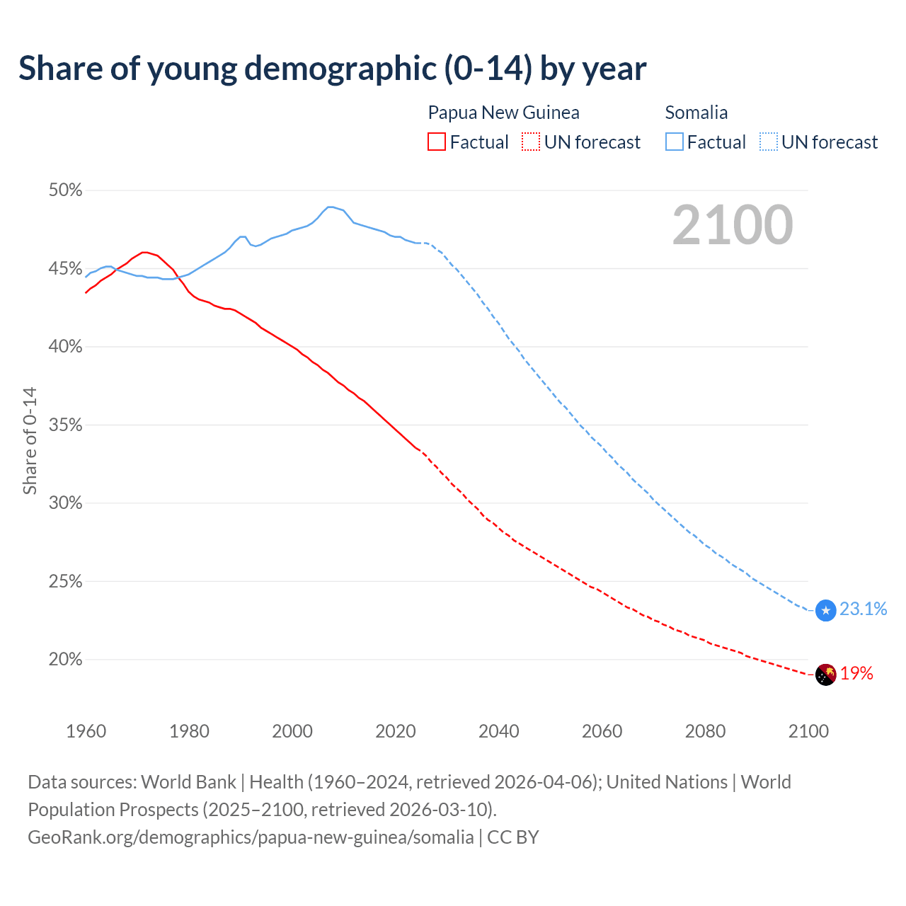 - The share of young demographic (0-15 years old) in Papua New Guinea is 33.5% vs 46.6% in Somalia.