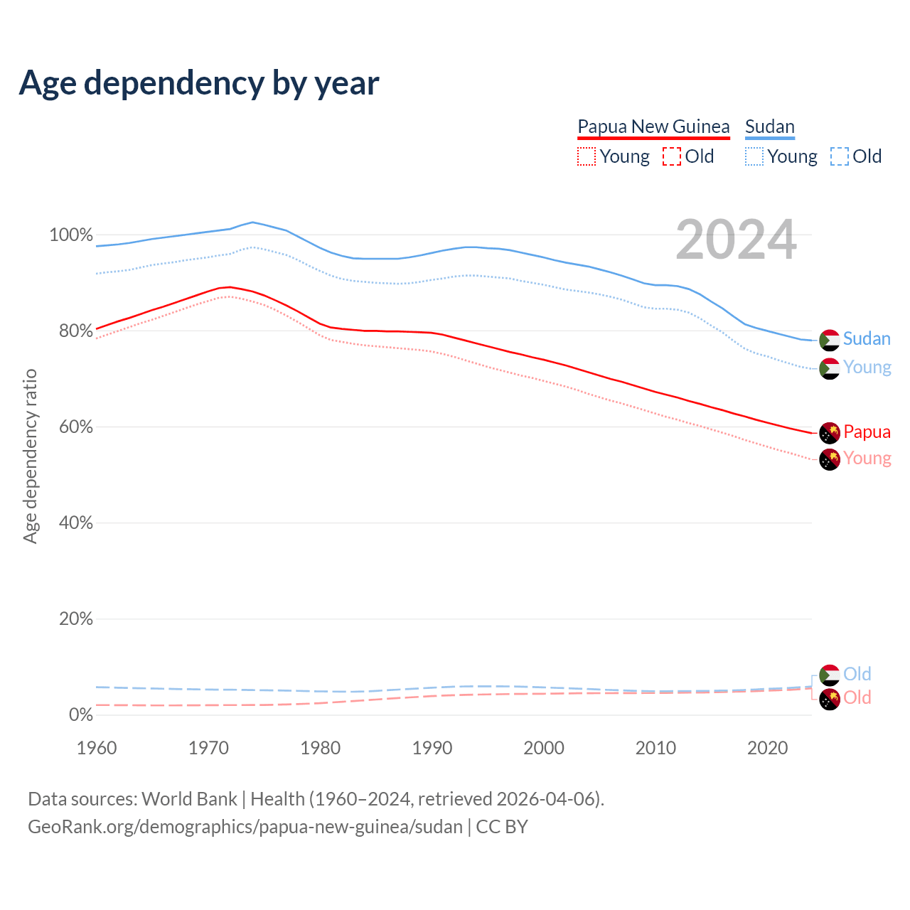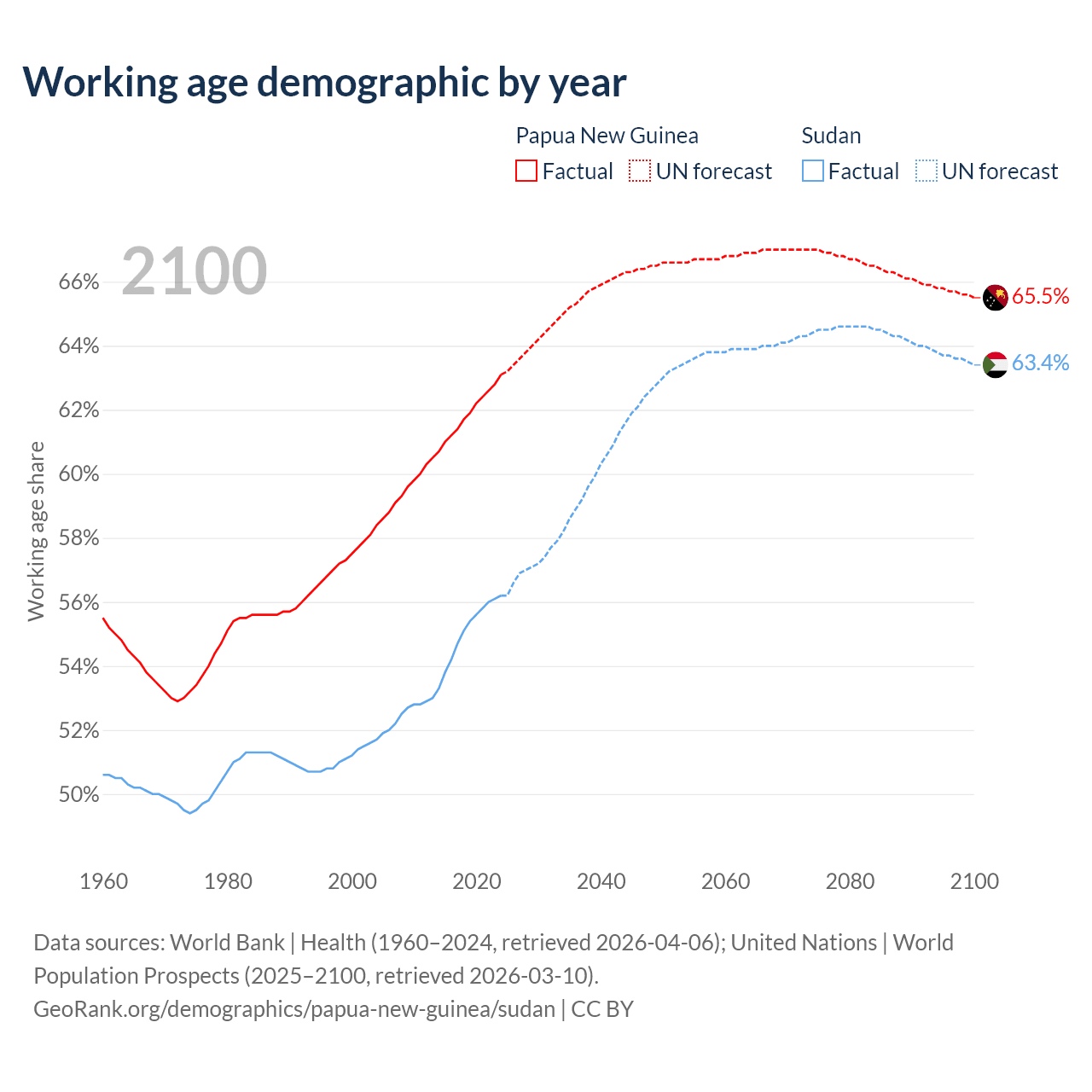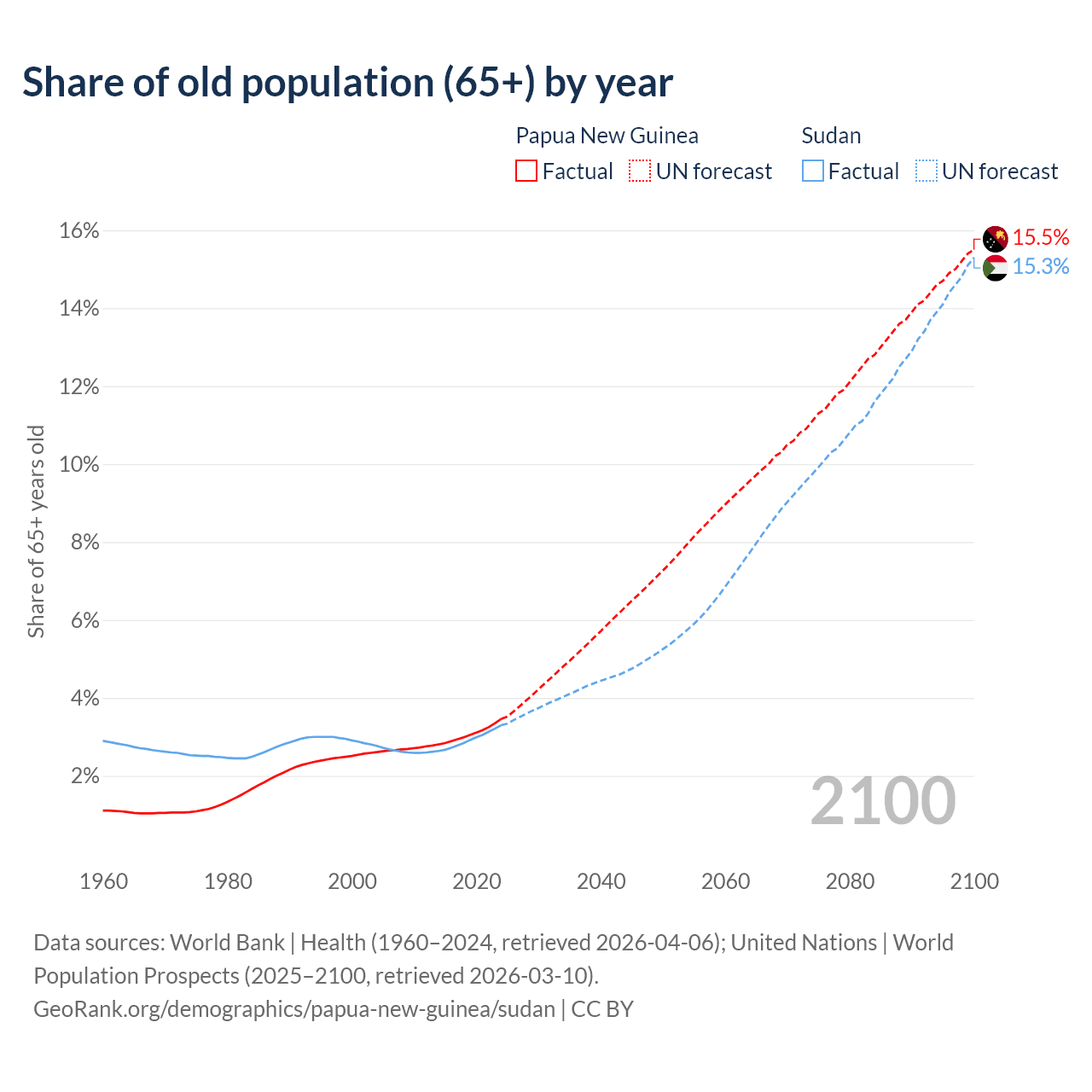 - The share of old-age demographic (65+) in Papua New Guinea is 3.46% vs 3.3% in Sudan.