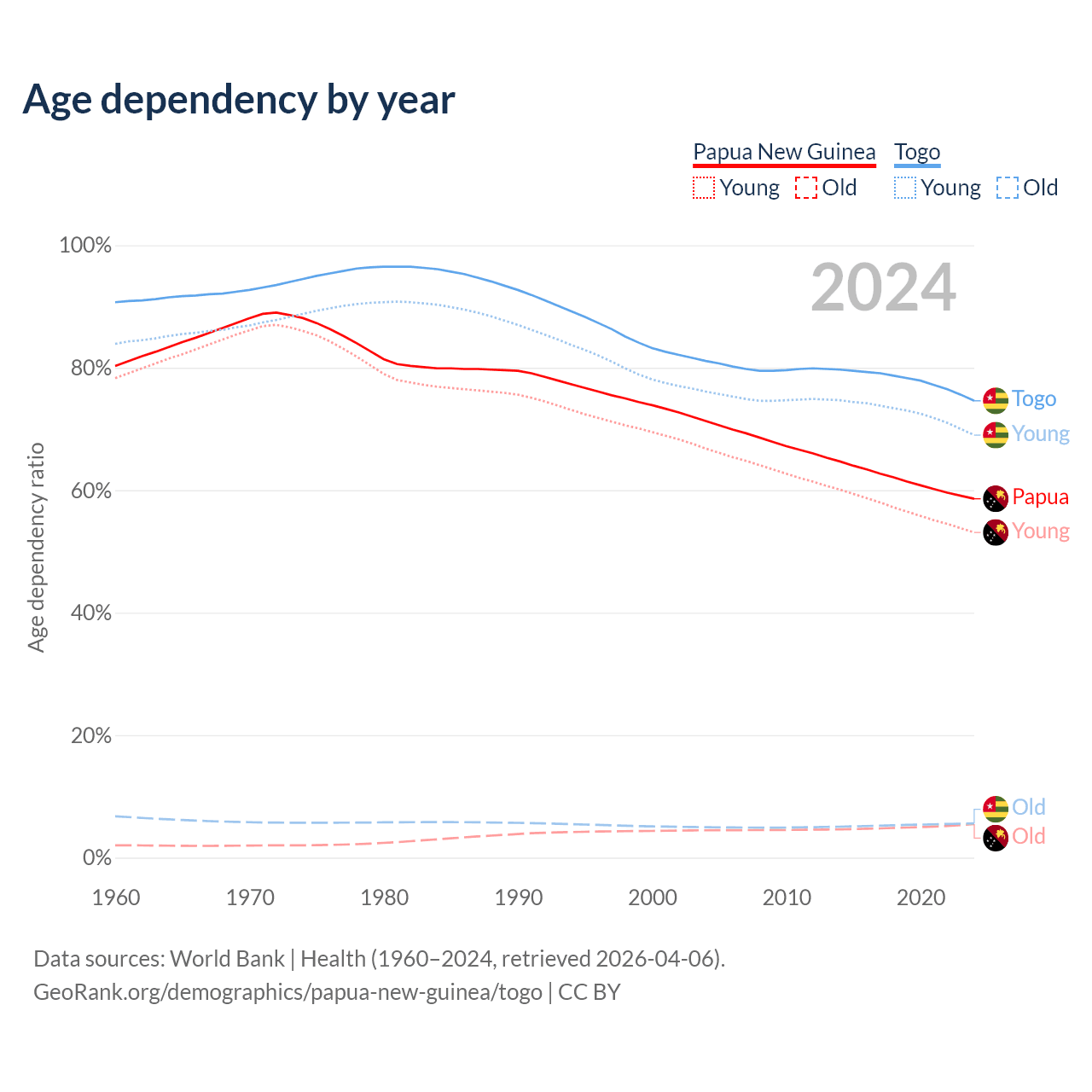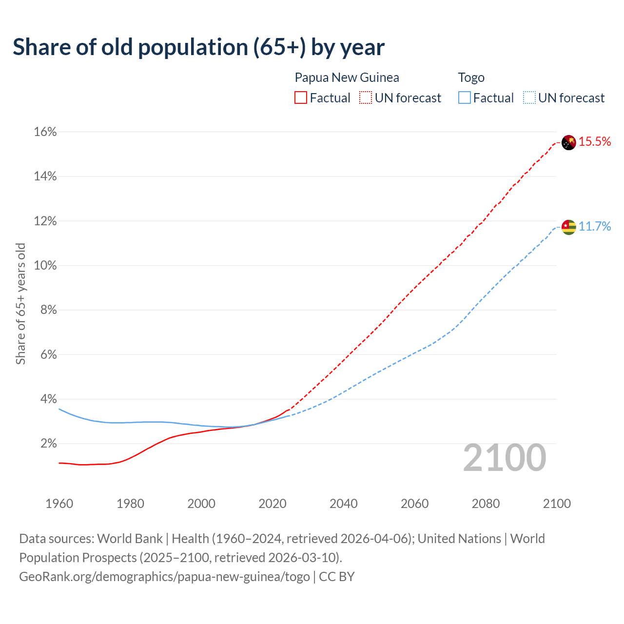 - The share of old-age demographic (65+) in Papua New Guinea is 3.46% vs 3.21% in Togo.