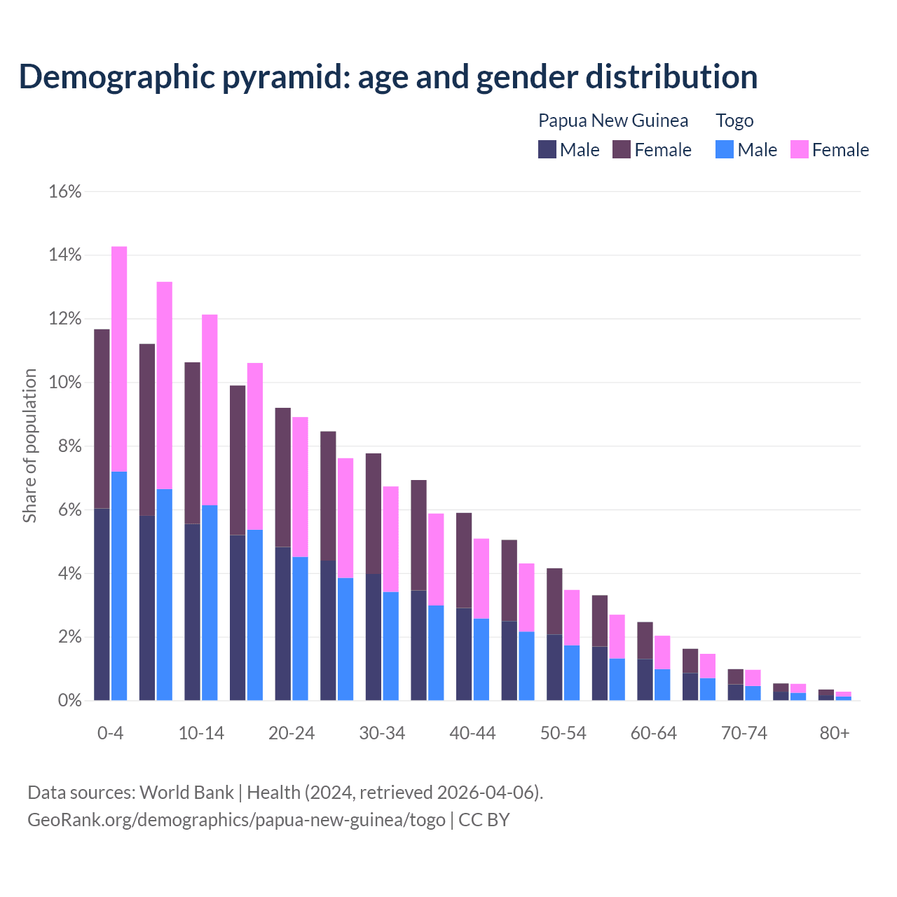 - The share of young demographic (0-15 years old) in Papua New Guinea is 33.5% vs 39.5% in Togo.