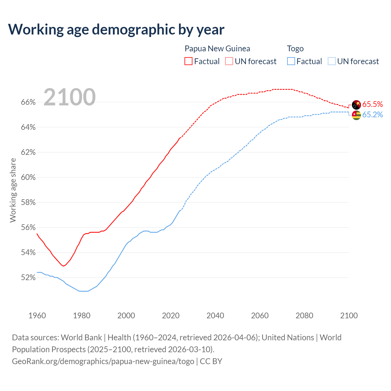 - Papua New Guinea has 6.94M working age adults (aged 15-64) vs 5.72M in Togo.