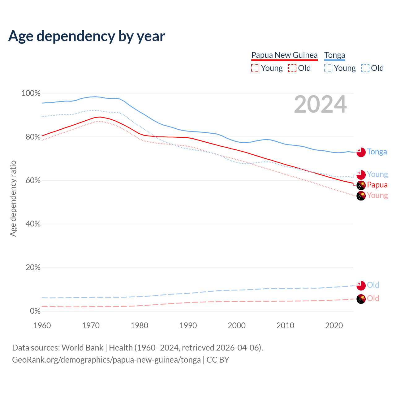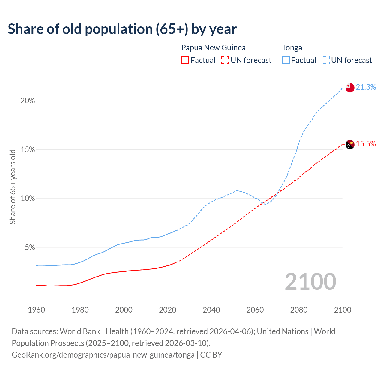 The share of older people aged 65 and over is 3.46% in Papua New Guinea and 6.72% in Tonga. Life expectancy in Papua New Guinea compared to Tonga .