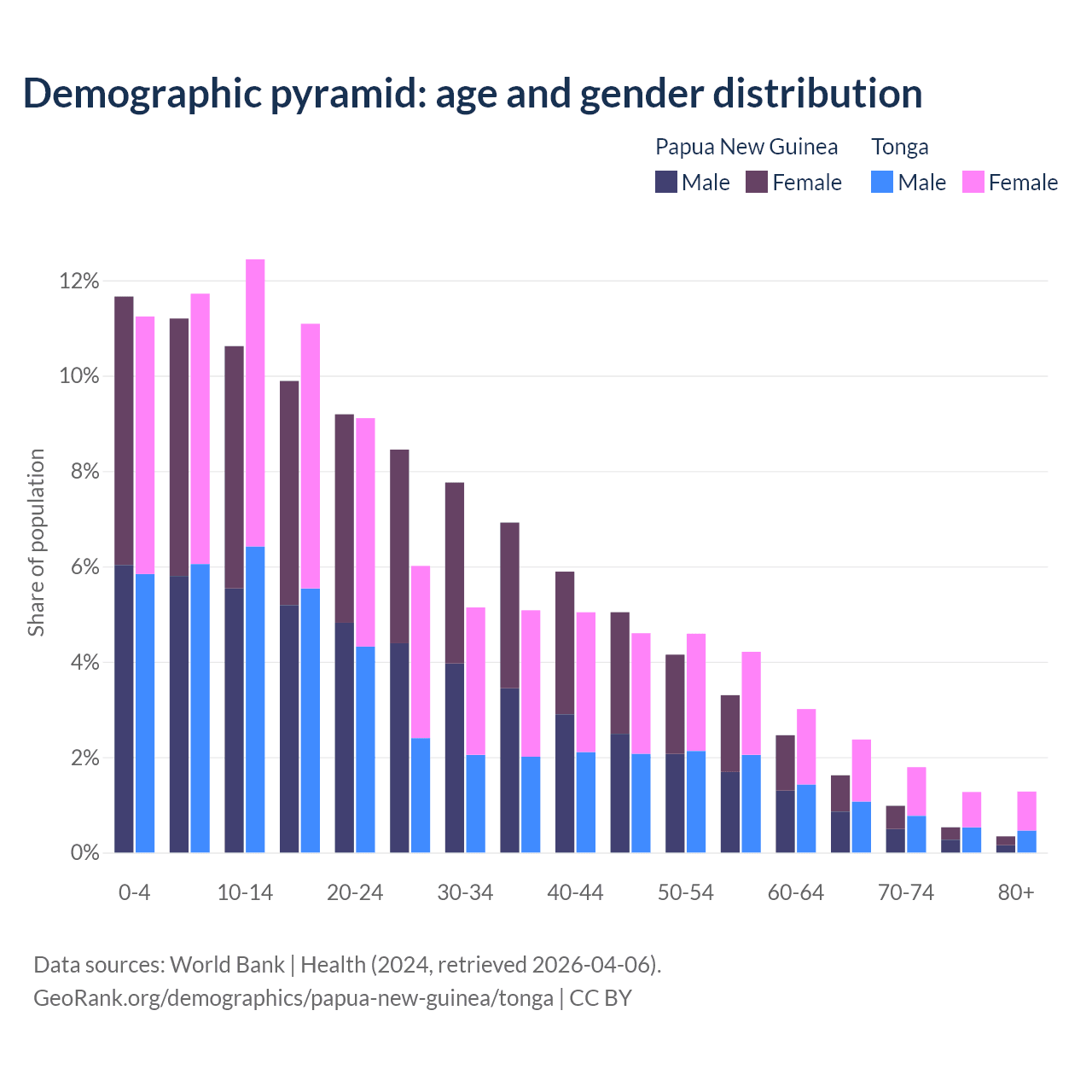 - As of 2026, the population of Papua New Guinea is 11M vs 103K in Tonga - 106.5 times difference.