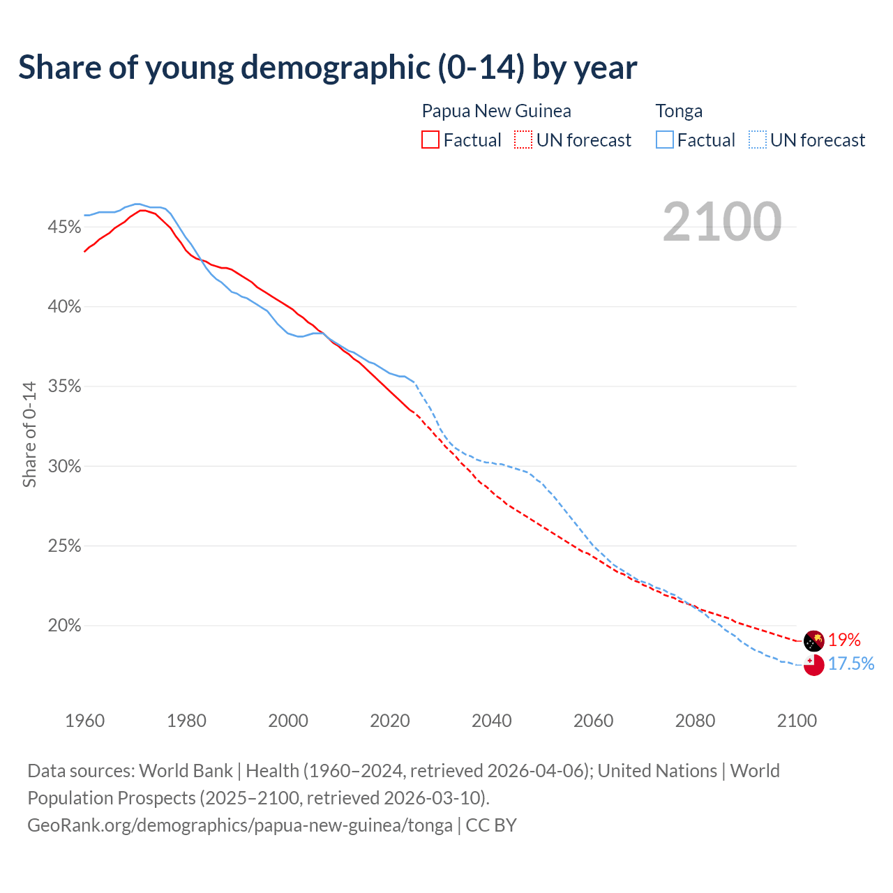 - The share of young demographic (0-15 years old) in Papua New Guinea is 33.5% vs 35.4% in Tonga.