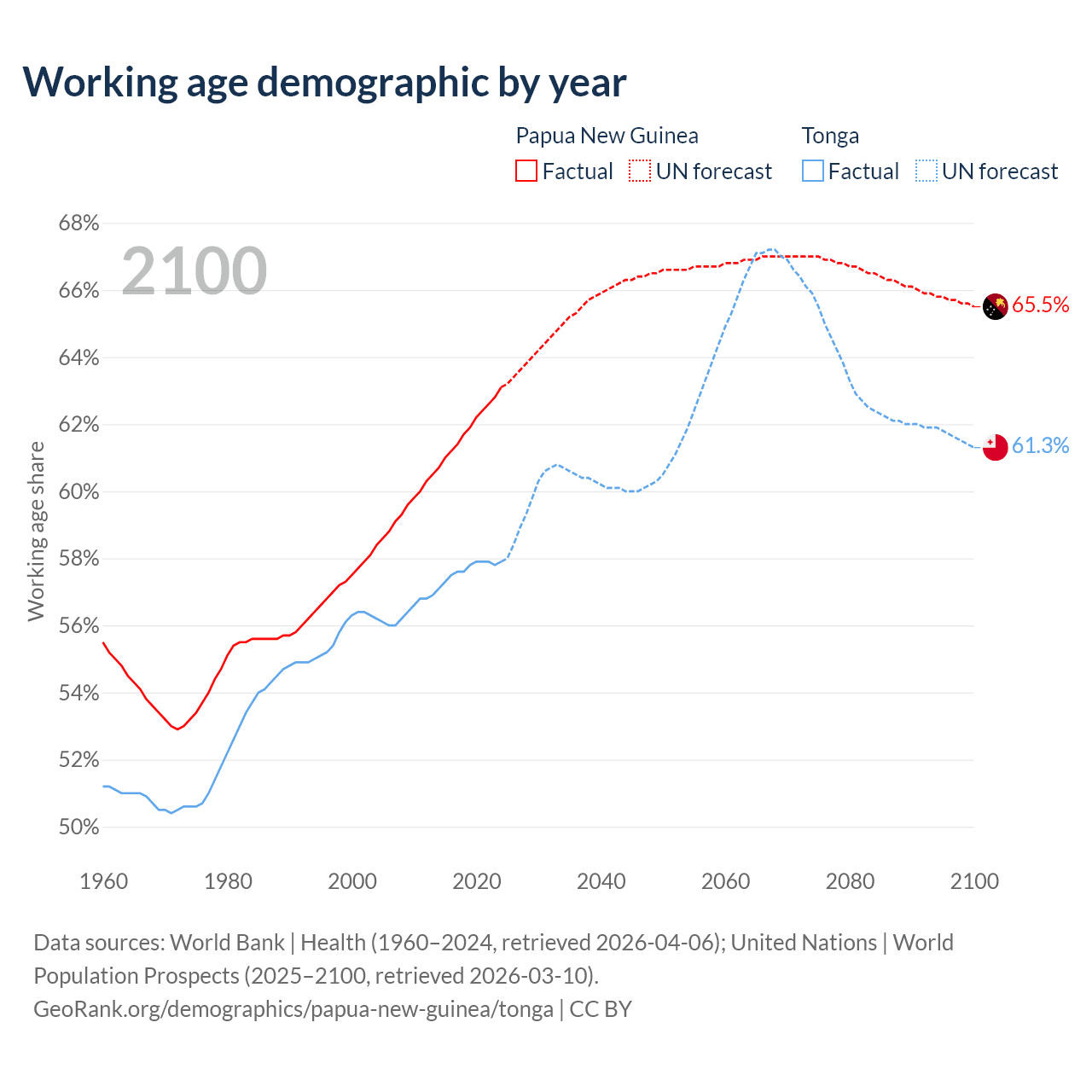 - Papua New Guinea has 6.94M working age adults (aged 15-64) vs 59.8K in Tonga.