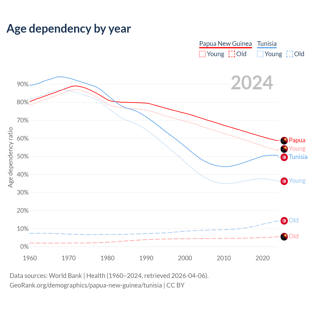 - Papua New Guinea is ranked 140/196 by median age (oldest to youngest) vs 86/196 for Tunisia.
