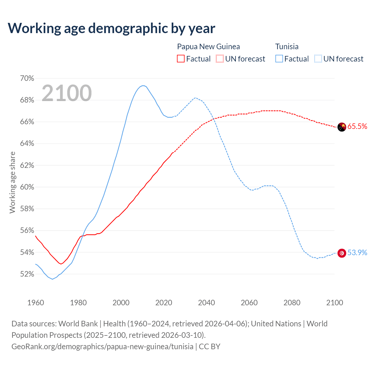 - Papua New Guinea has 6.94M working age adults (aged 15-64) vs 8.26M in Tunisia.