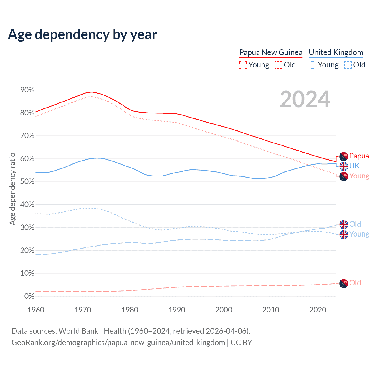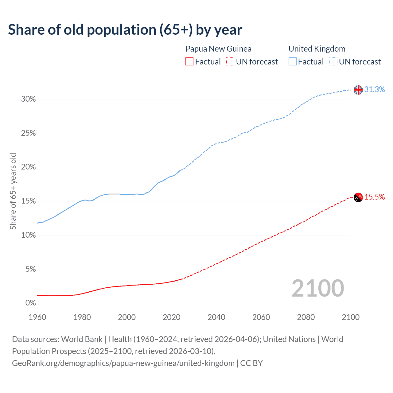 The share of older people aged 65 and over is 3.46% in Papua New Guinea and 19.5% in the United Kingdom. Life expectancy in Papua New Guinea compared to the United Kingdom .