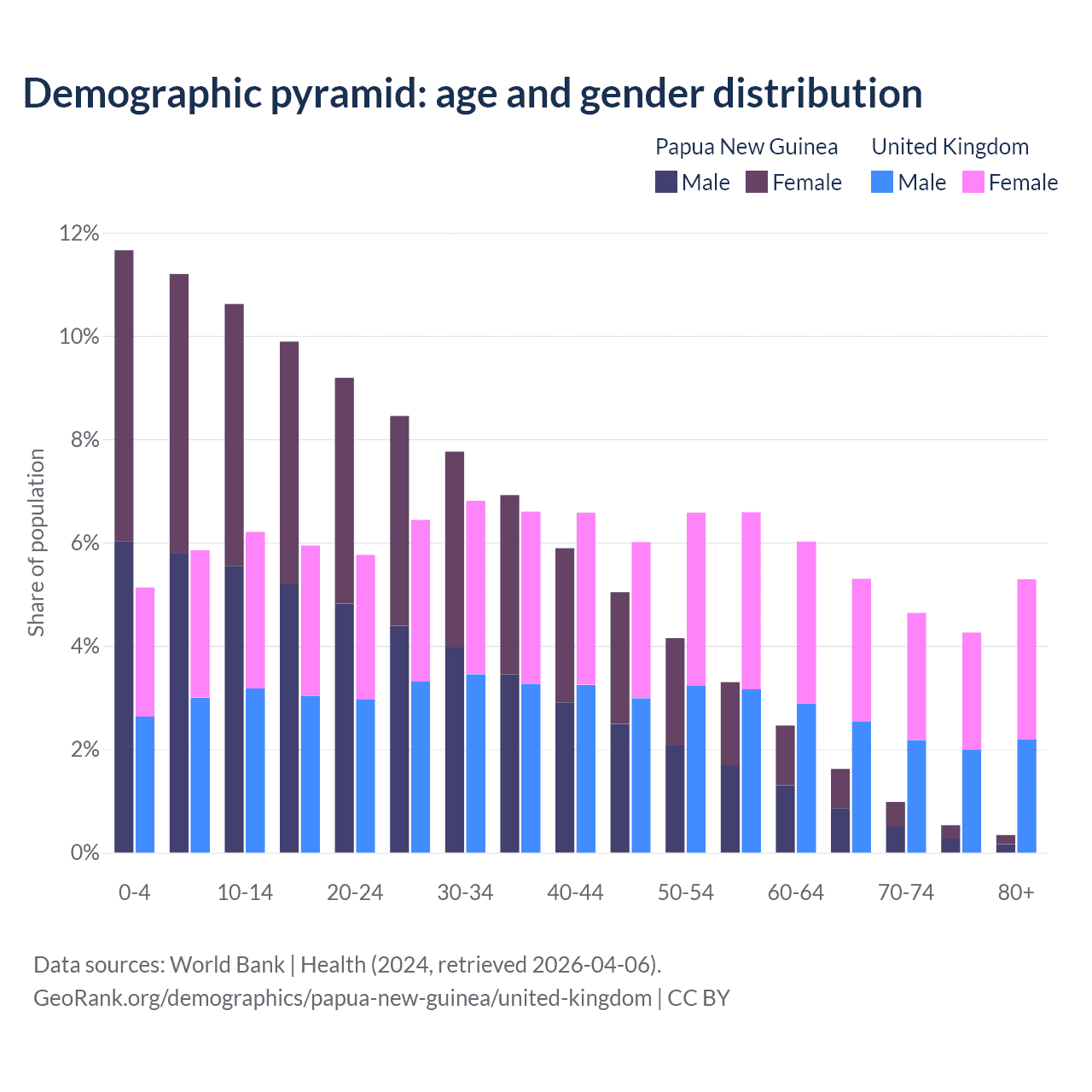 - The share of old-age demographic (65+) in Papua New Guinea is 3.46% vs 19.5% in the United Kingdom.