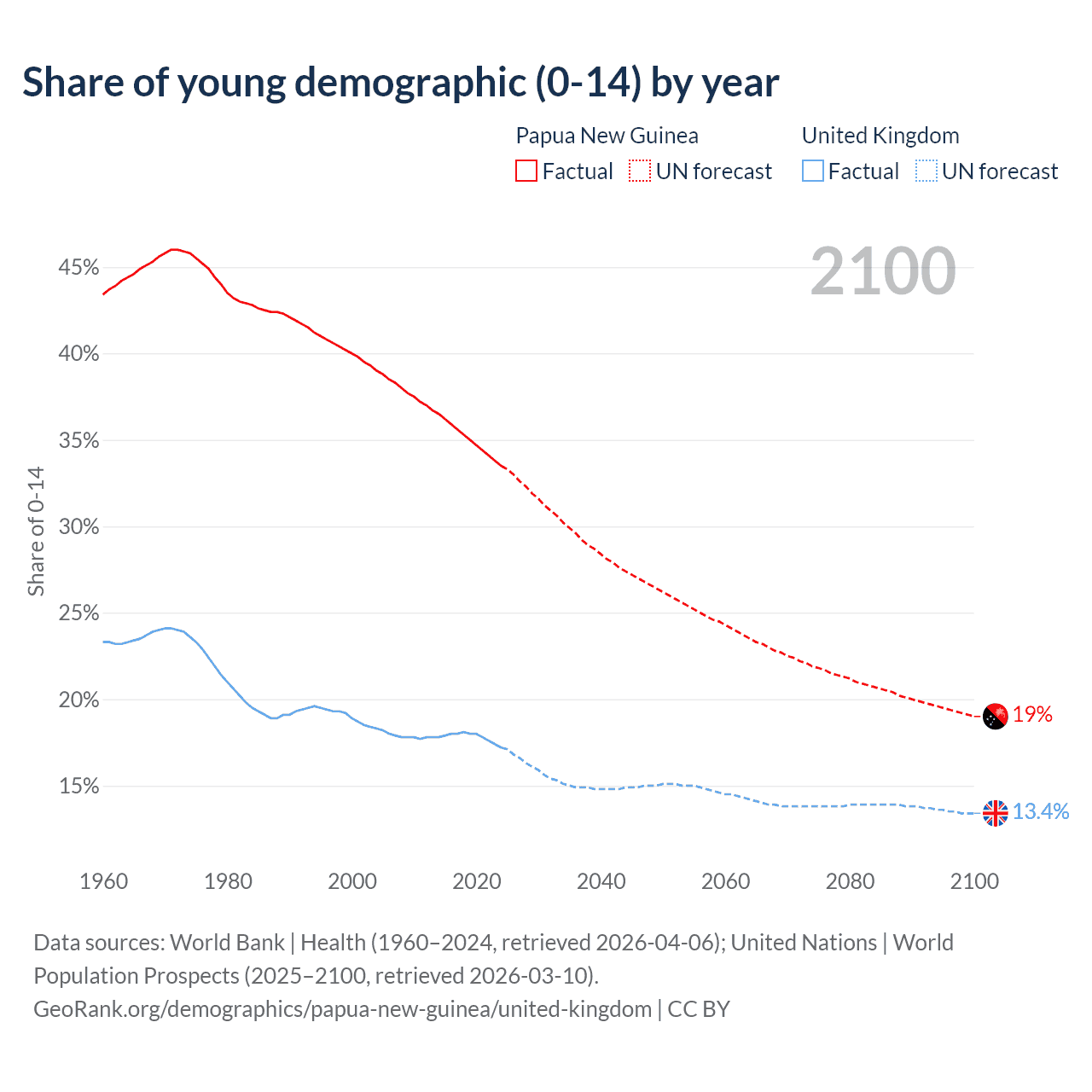 - The share of young demographic (0-15 years old) in Papua New Guinea is 33.5% vs 17.2% in the United Kingdom.