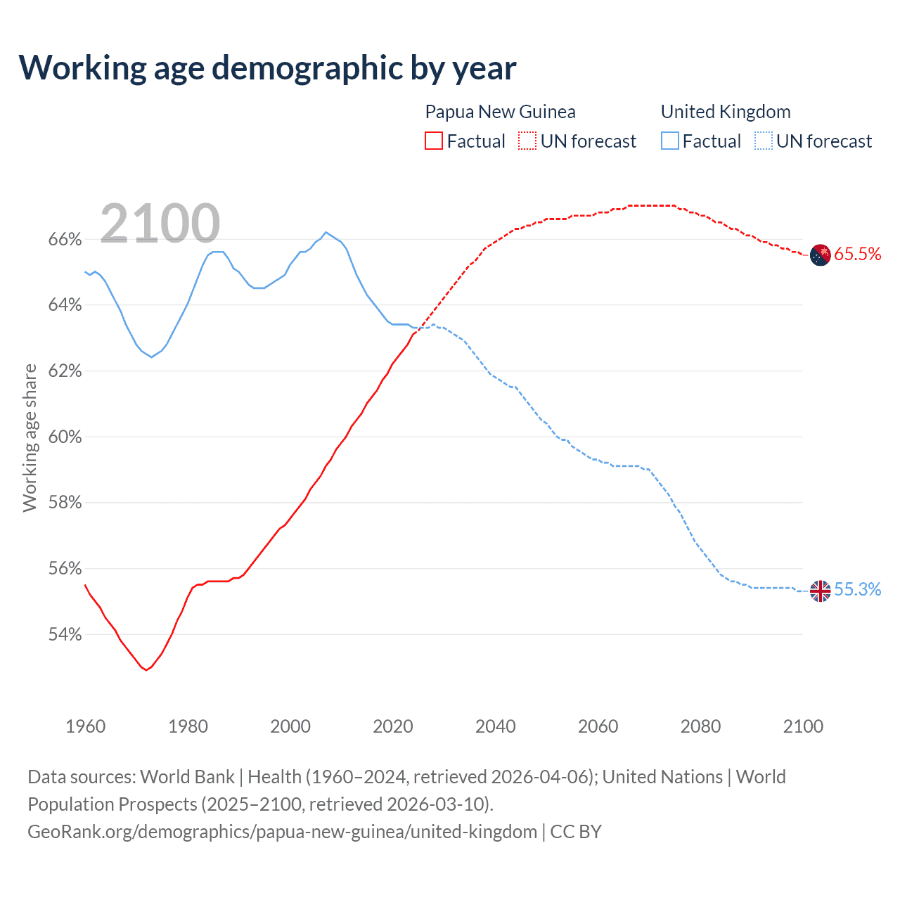 Median age Papua New Guinea vs United Kingdom, 1960-2100