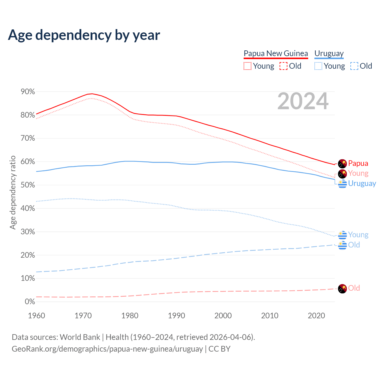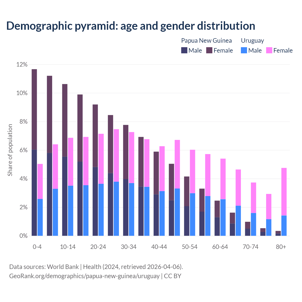 - Papua New Guinea is ranked 140/196 by median age (oldest to youngest) vs 63/196 for Uruguay.
