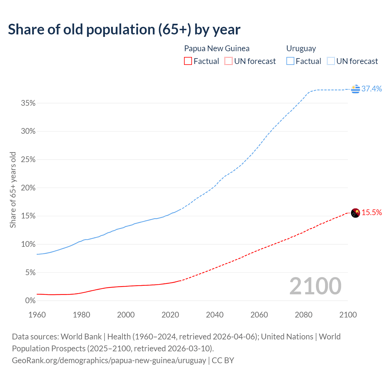 The share of older people aged 65 and over is 3.46% in Papua New Guinea and 16% in Uruguay. Life expectancy in Papua New Guinea compared to Uruguay .