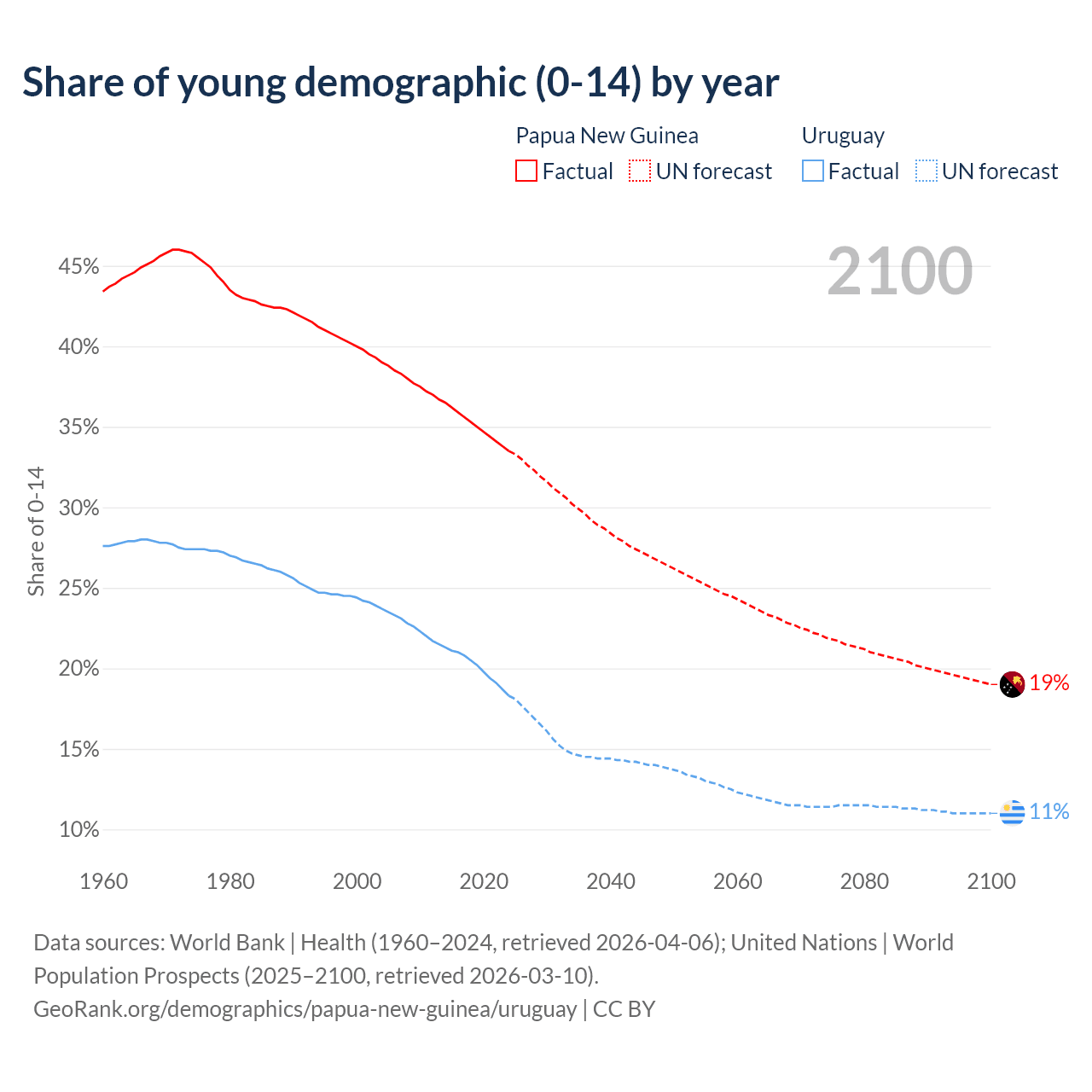 - The share of young demographic (0-15 years old) in Papua New Guinea is 33.5% vs 18.3% in Uruguay.