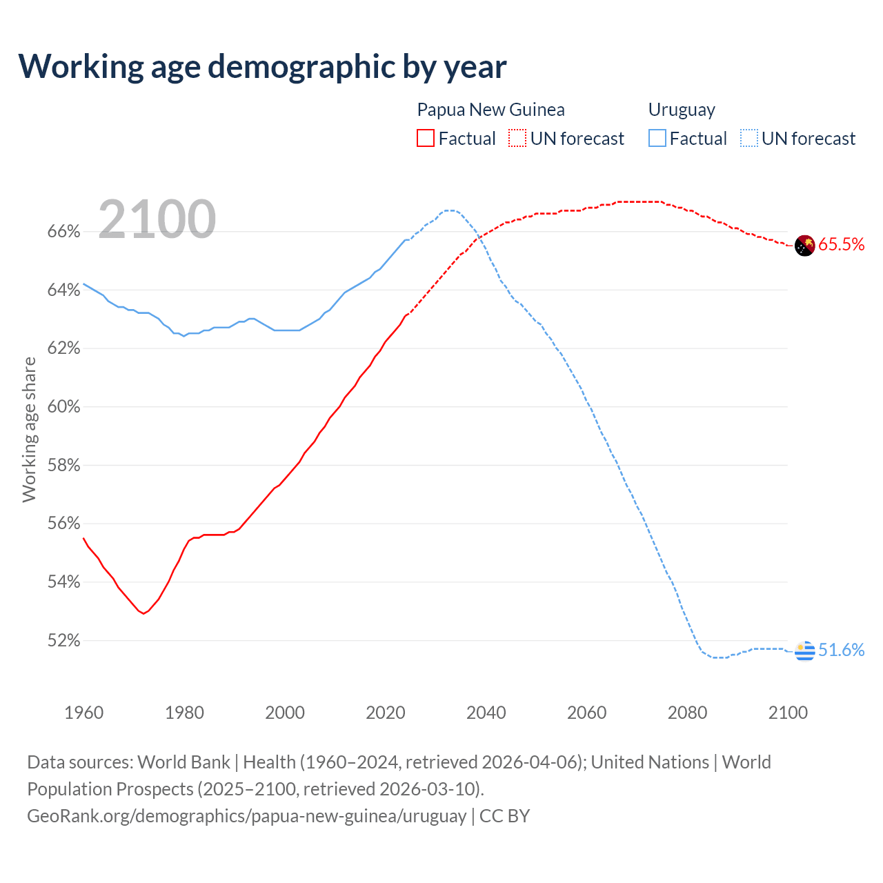 - Papua New Guinea has 6.94M working age adults (aged 15-64) vs 2.22M in Uruguay.