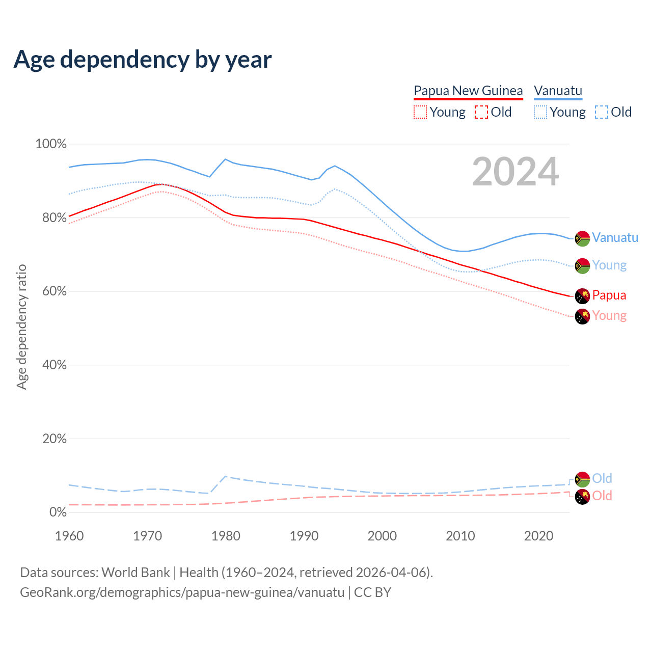 The share of older people aged 65 and over is 3.46% in Papua New Guinea and 4.3% in Vanuatu. Life expectancy in Papua New Guinea compared to Vanuatu .
