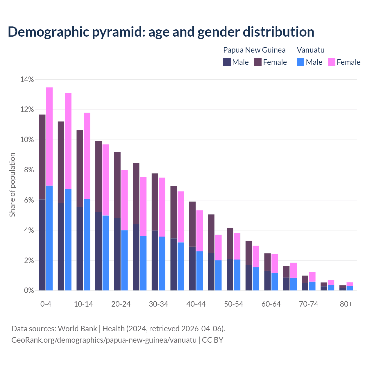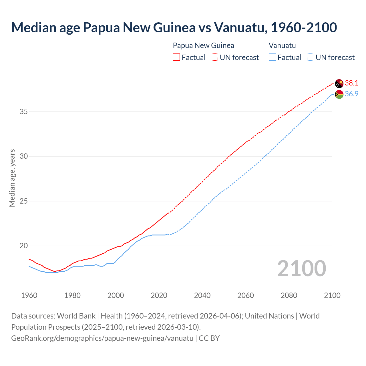 - Papua New Guinea is ranked 140/196 by median age (oldest to youngest) vs 156/196 for Vanuatu.