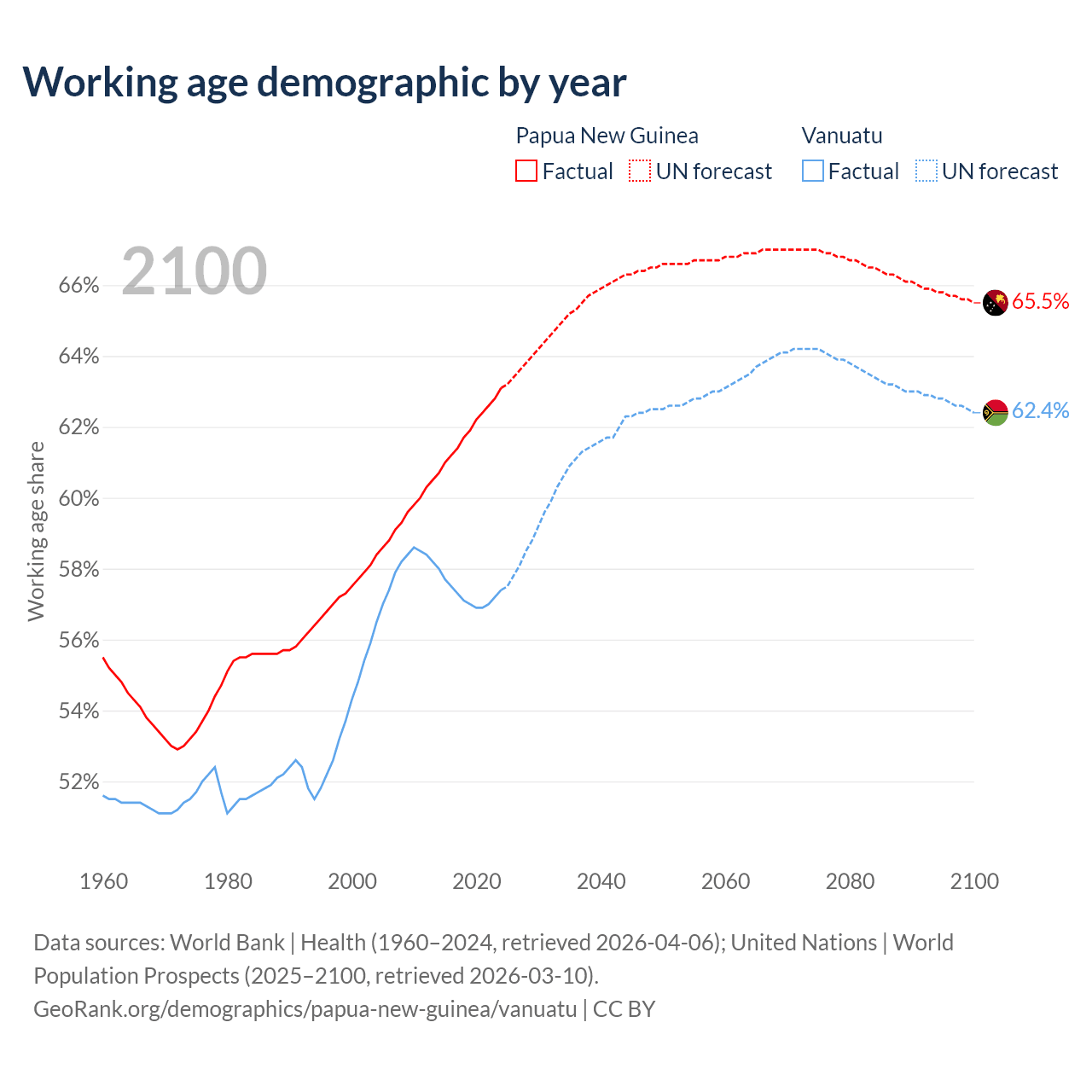 - Papua New Guinea has 6.94M working age adults (aged 15-64) vs 198K in Vanuatu.