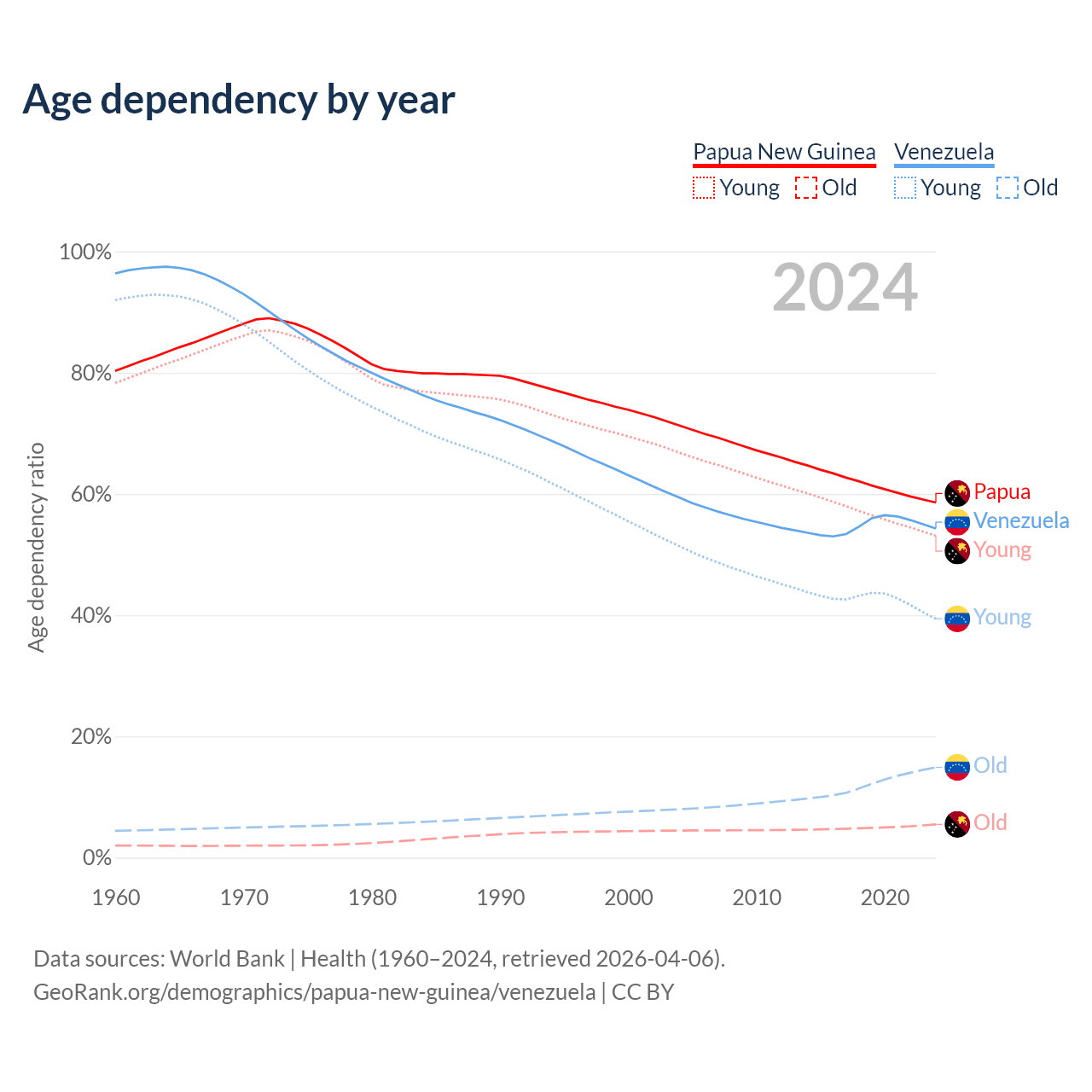 The share of older people aged 65 and over is 3.46% in Papua New Guinea and 9.68% in Venezuela. Life expectancy in Papua New Guinea compared to Venezuela .