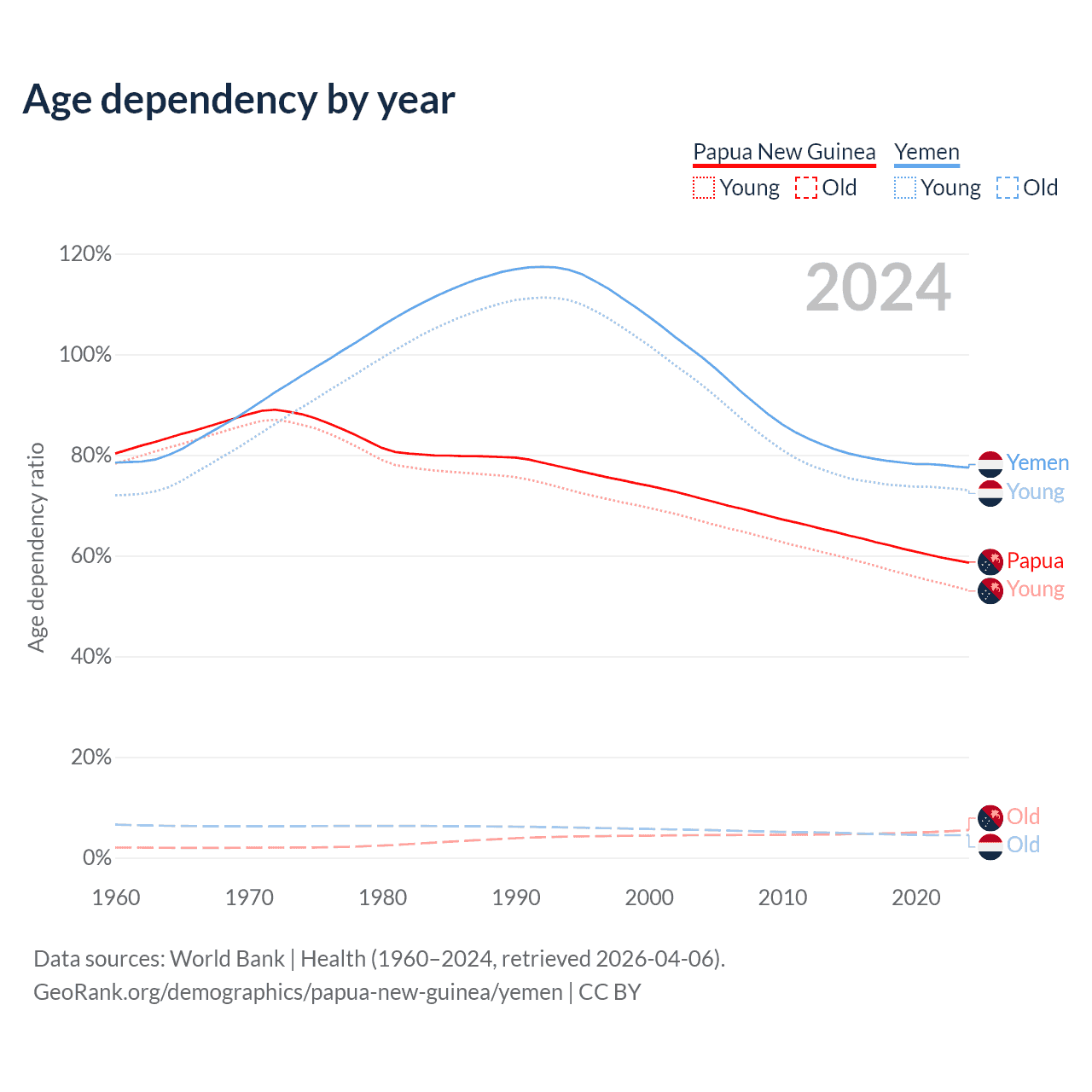 - The share of old-age demographic (65+) in Papua New Guinea is 3.46% vs 2.52% in Yemen.