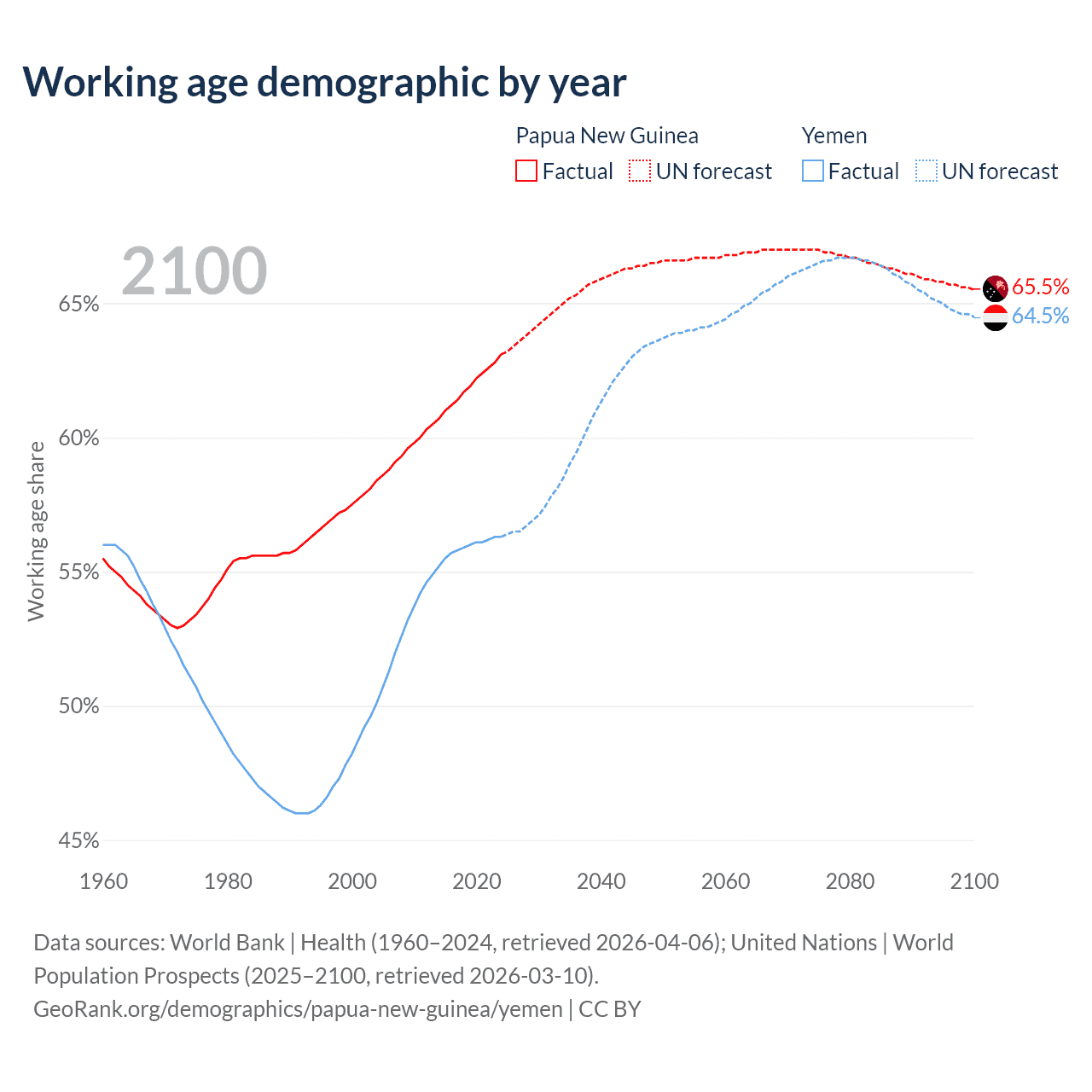 - Papua New Guinea has 6.94M working age adults (aged 15-64) vs 24.4M in Yemen.