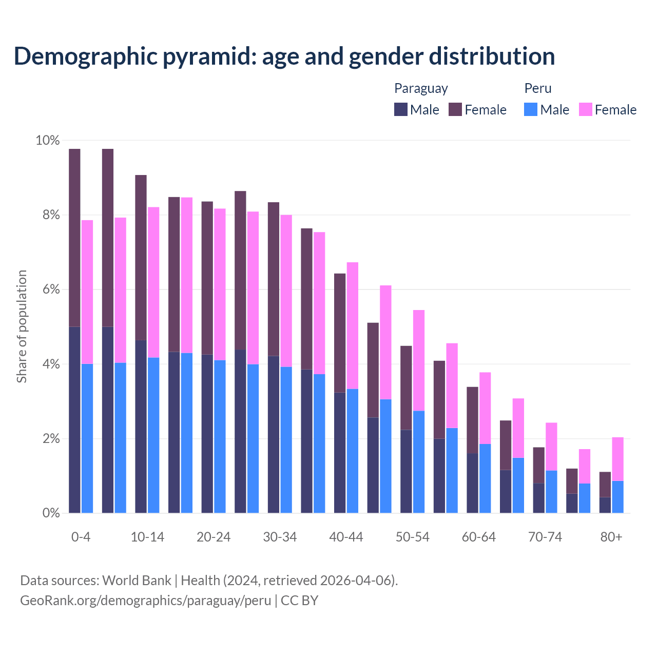 - Paraguay is ranked 118/196 by median age (oldest to youngest) vs 97/196 for Peru.