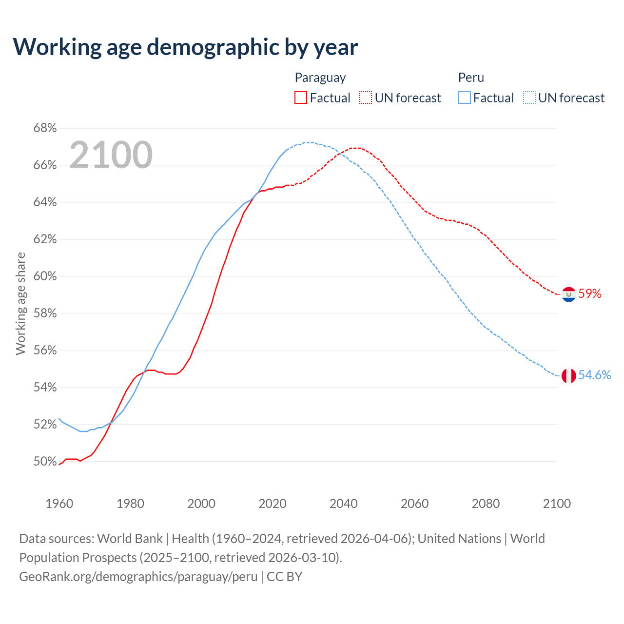 Median age Paraguay vs Peru, 1960-2100