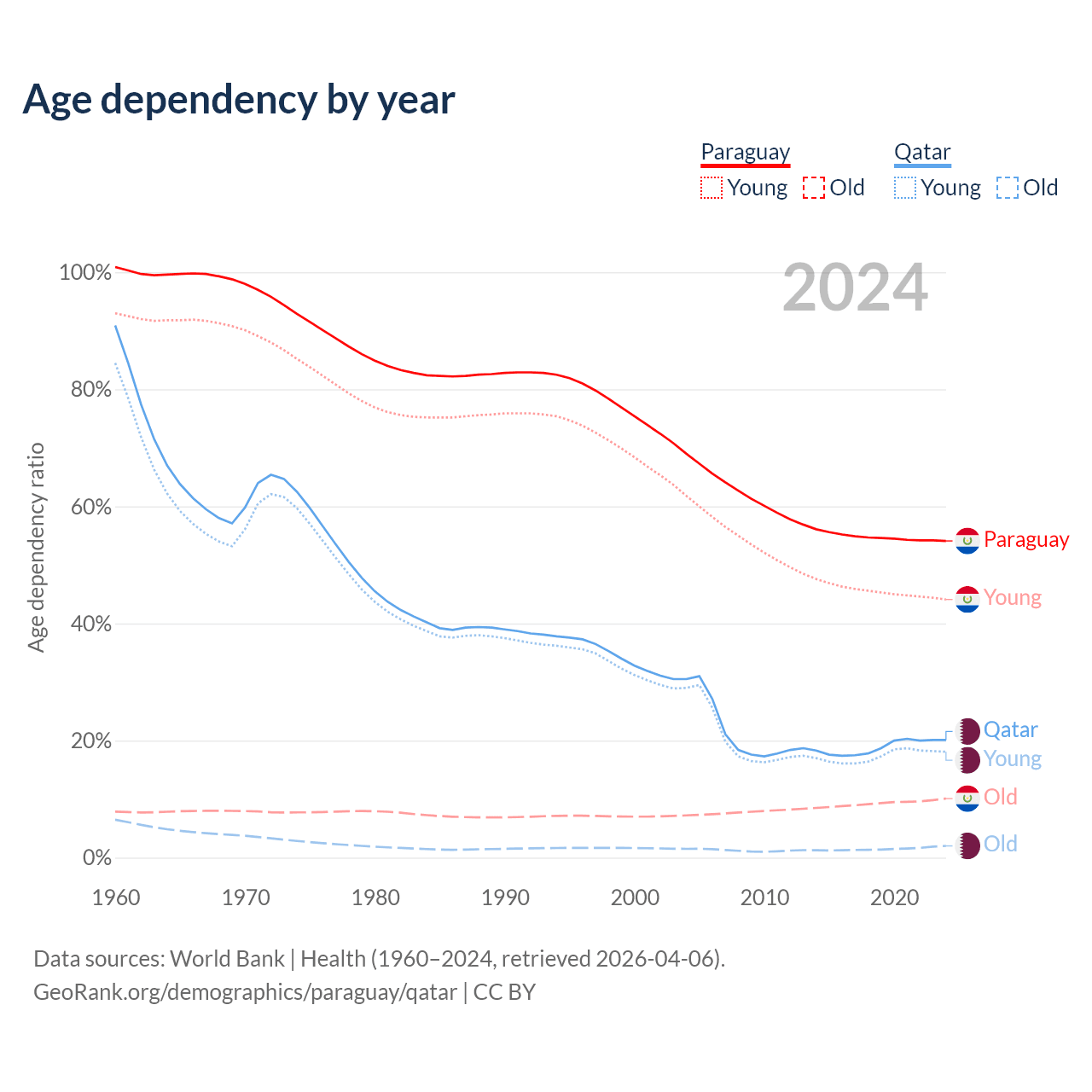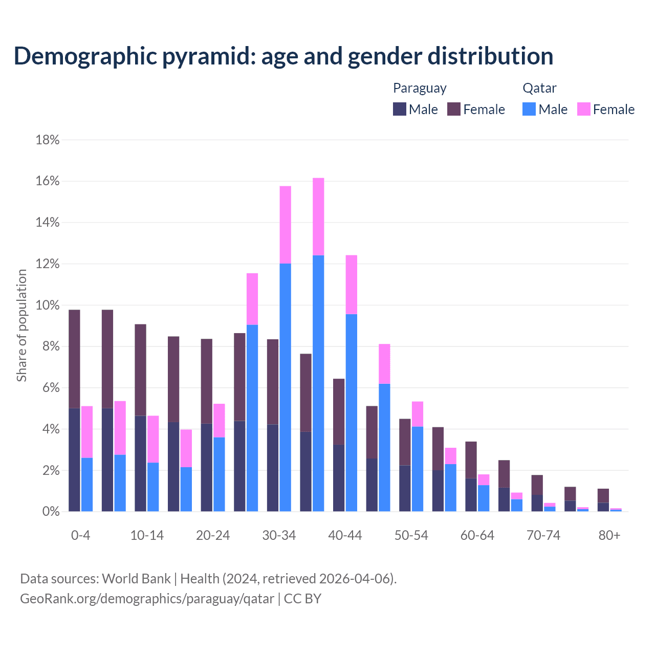 - Paraguay is ranked 118/196 by median age (oldest to youngest) vs 78/196 for Qatar.