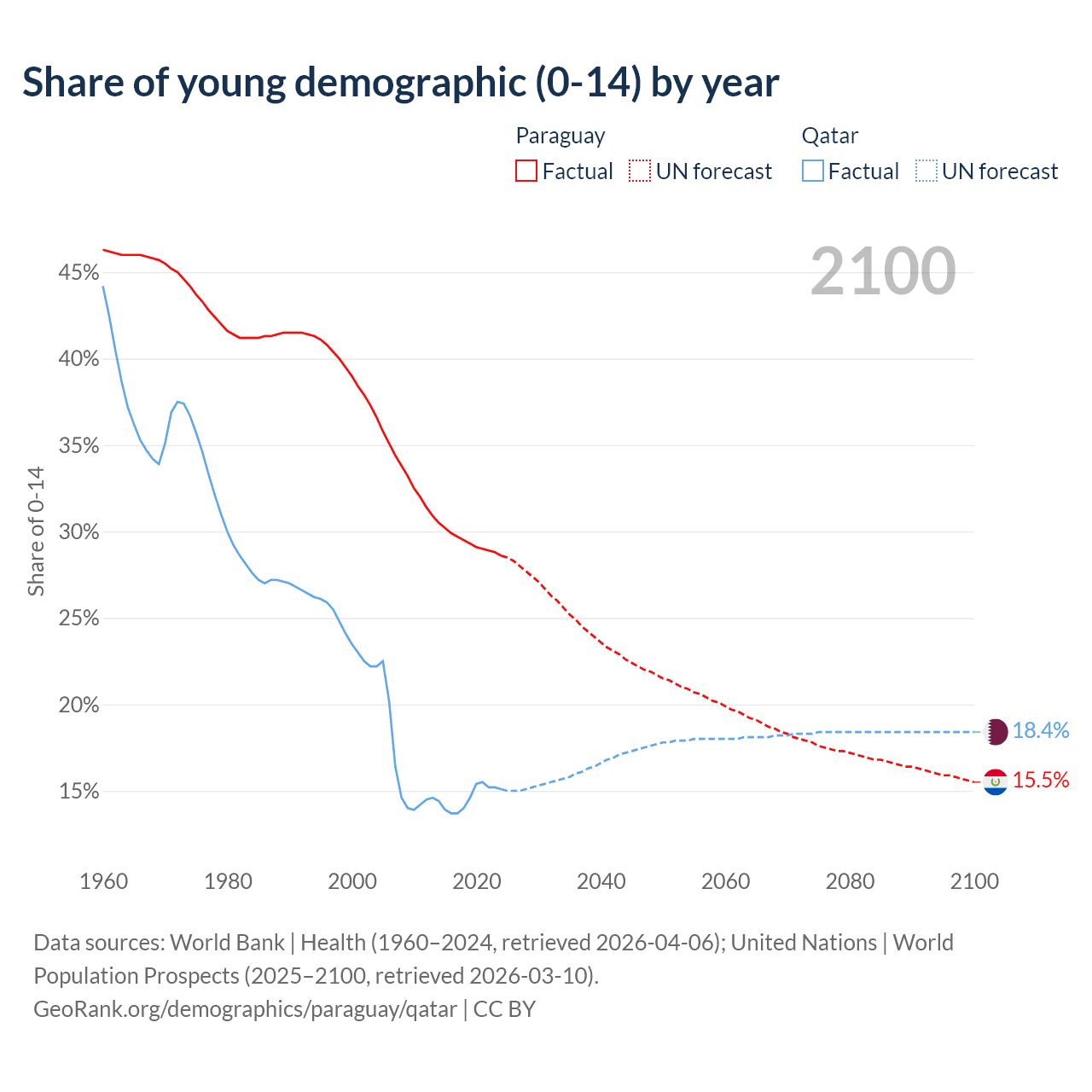 - The share of young demographic (0-15 years old) in Paraguay is 28.6% vs 15.1% in Qatar.