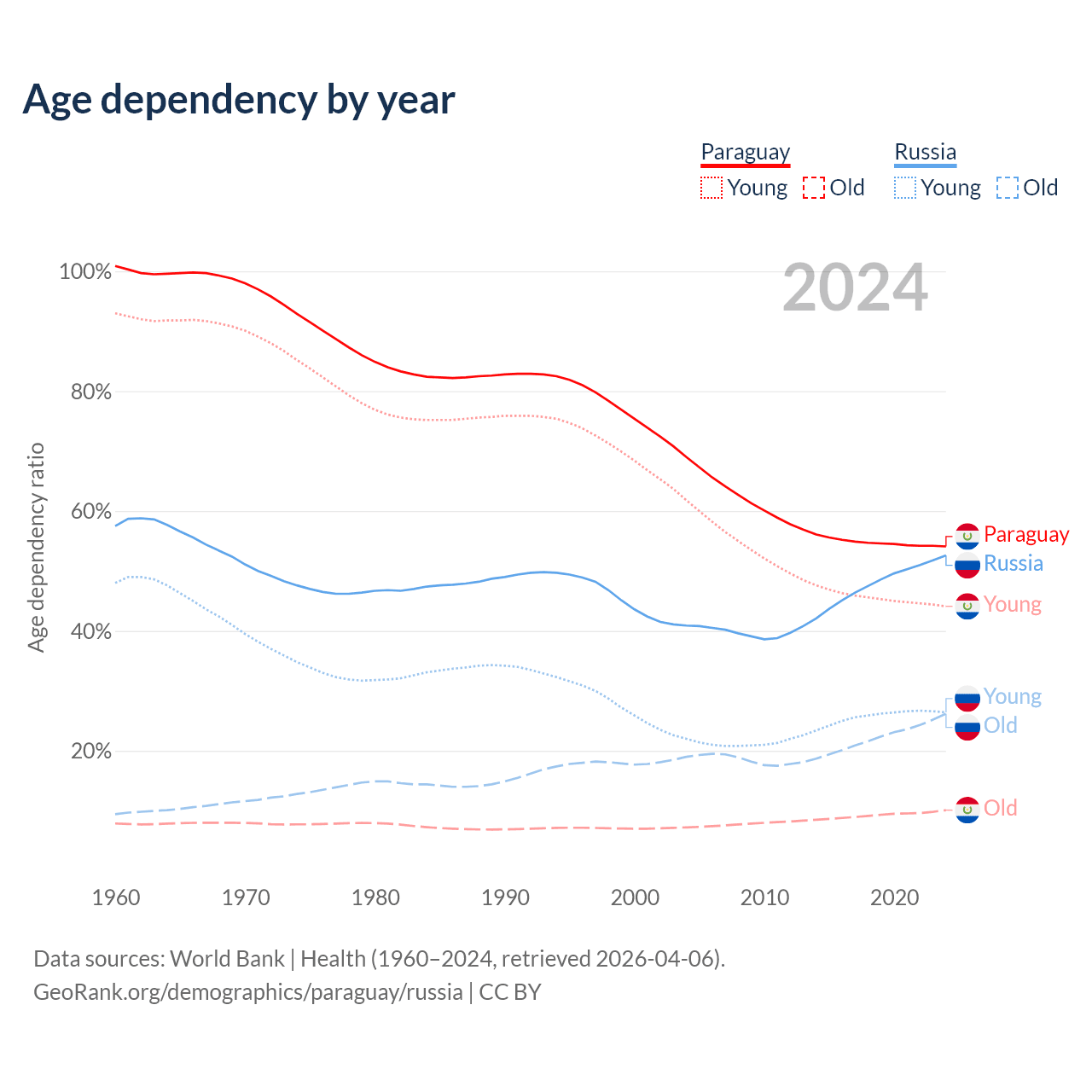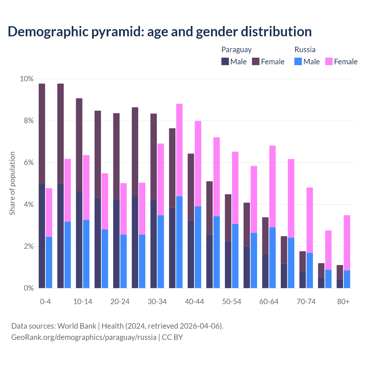 - Paraguay is ranked 118/196 by median age (oldest to youngest) vs 42/196 for Russia.