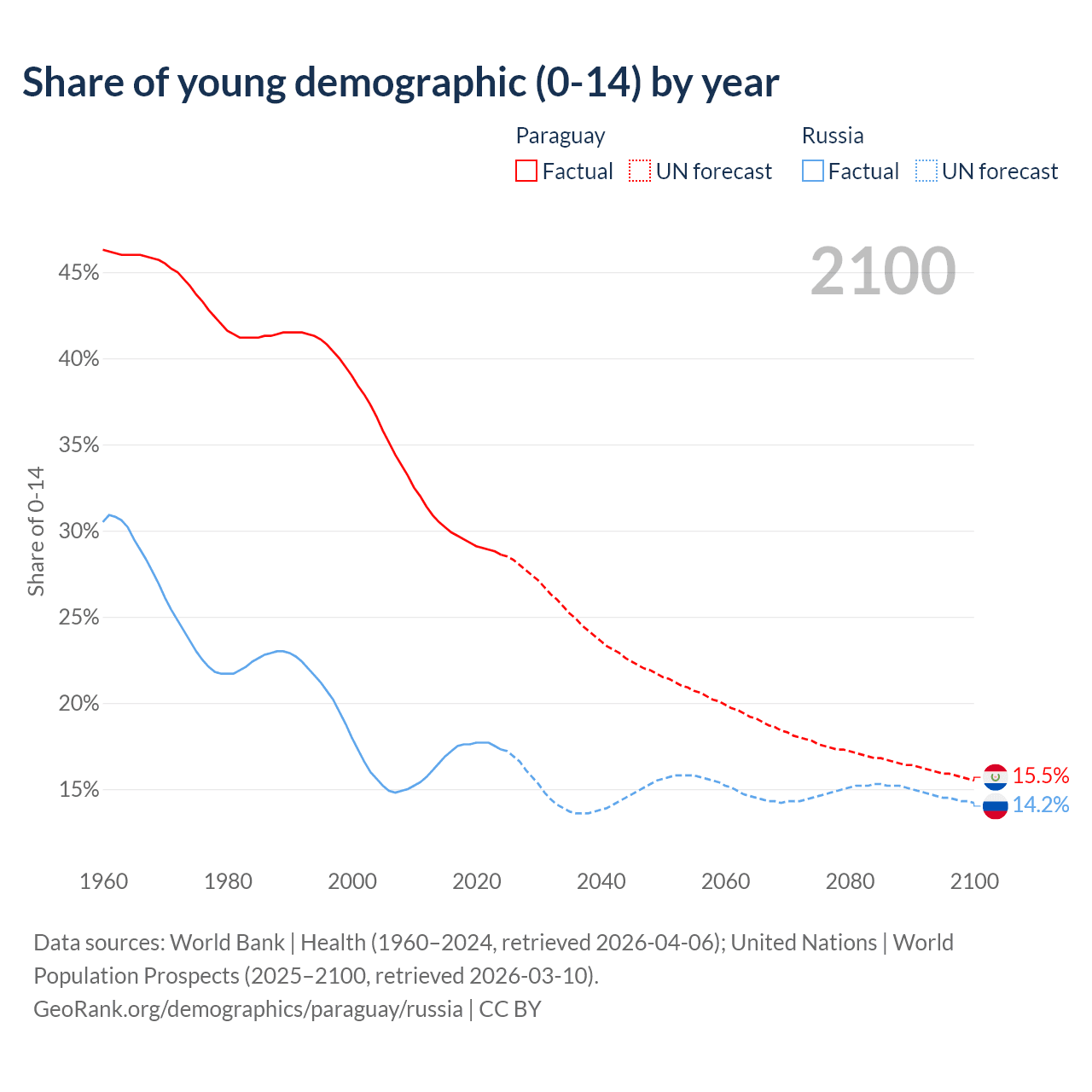 - The share of young demographic (0-15 years old) in Paraguay is 28.6% vs 17.3% in Russia.