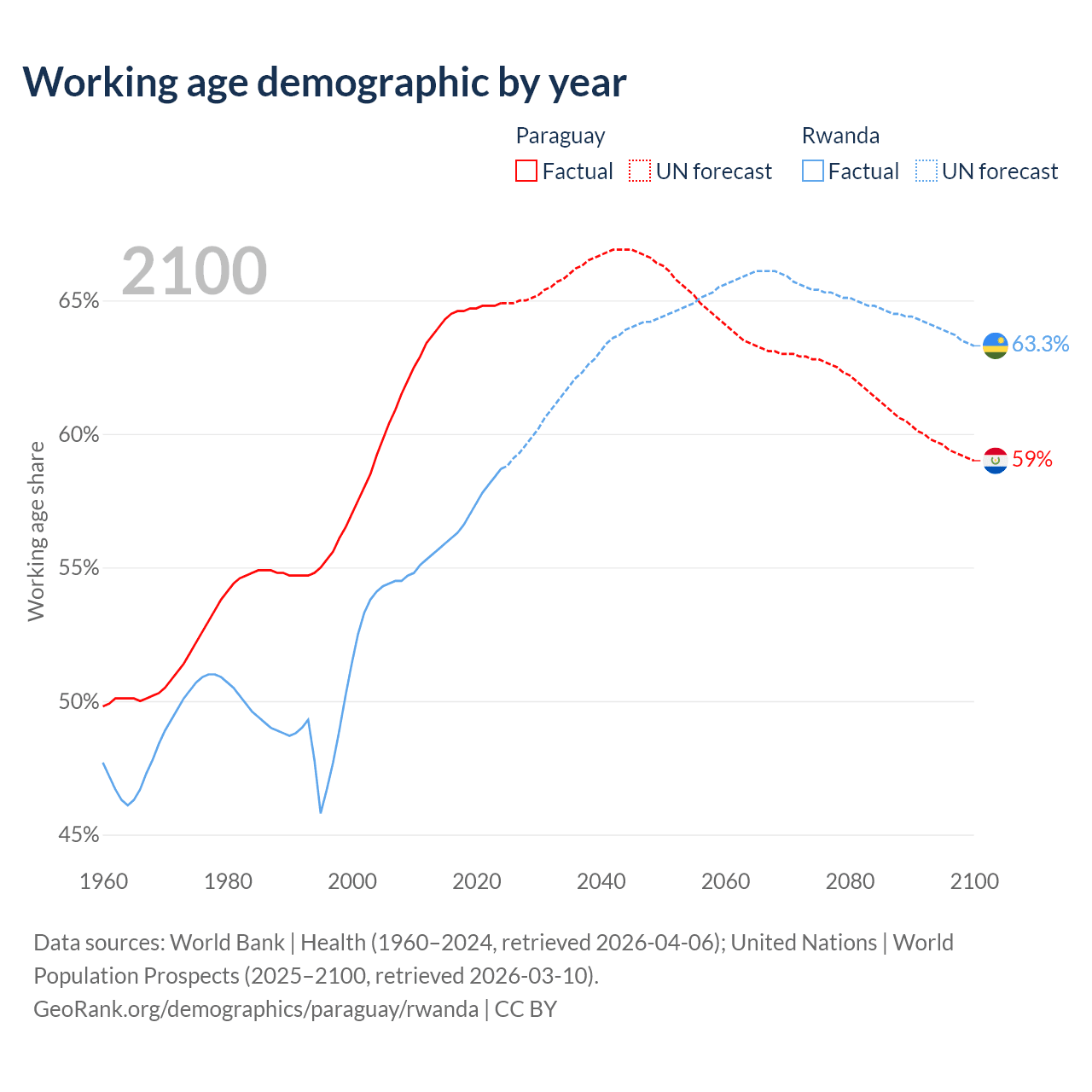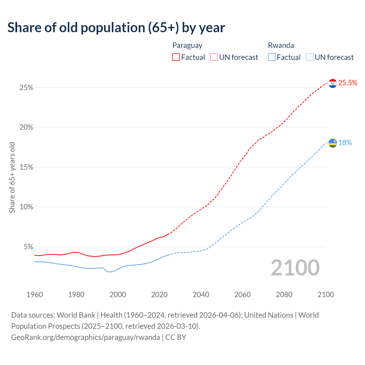 - The share of old-age demographic (65+) in Paraguay is 6.54% vs 3.93% in Rwanda.