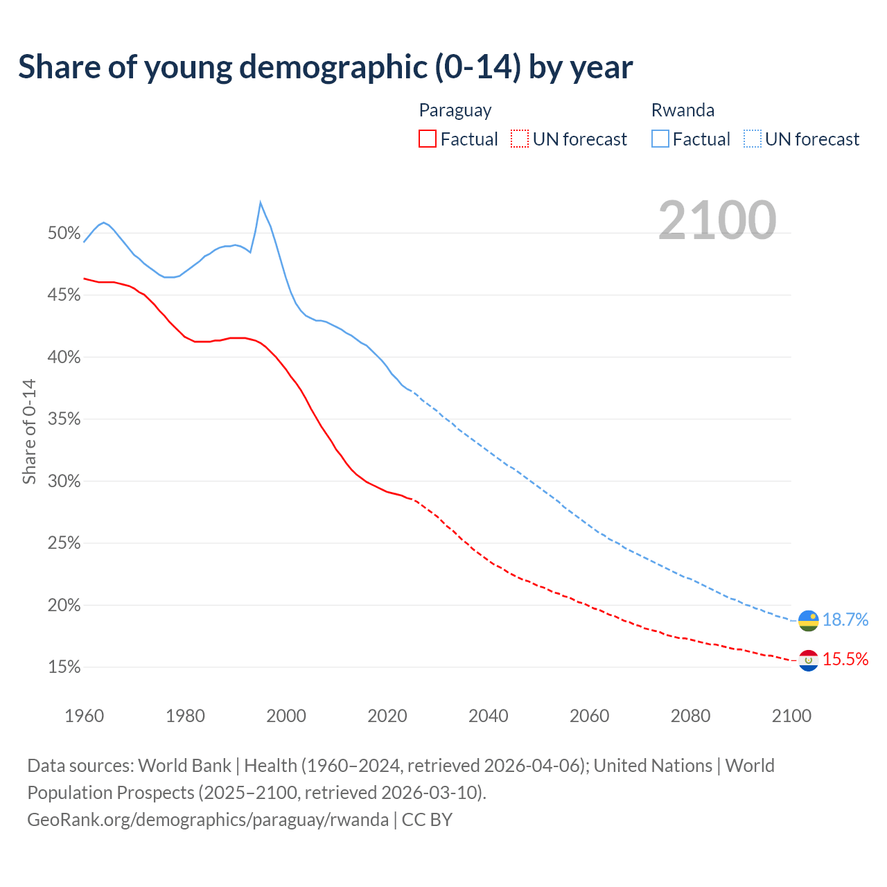 - The share of young demographic (0-15 years old) in Paraguay is 28.6% vs 37.4% in Rwanda.