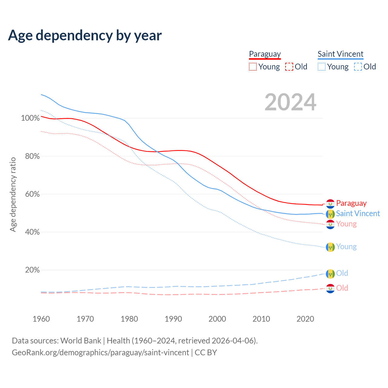 - The share of old-age demographic (65+) in Paraguay is 6.54% vs 11.9% in Saint Vincent.