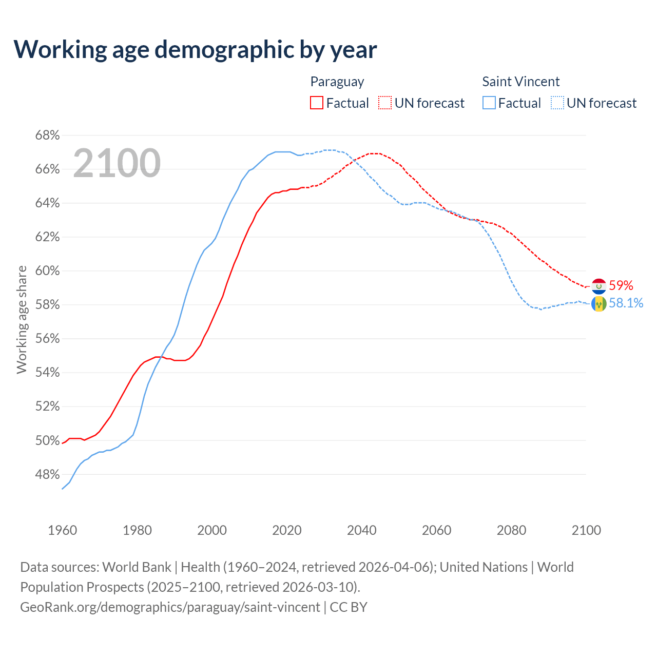 - Paraguay has 4.62M working age adults (aged 15-64) vs 66.3K in Saint Vincent.