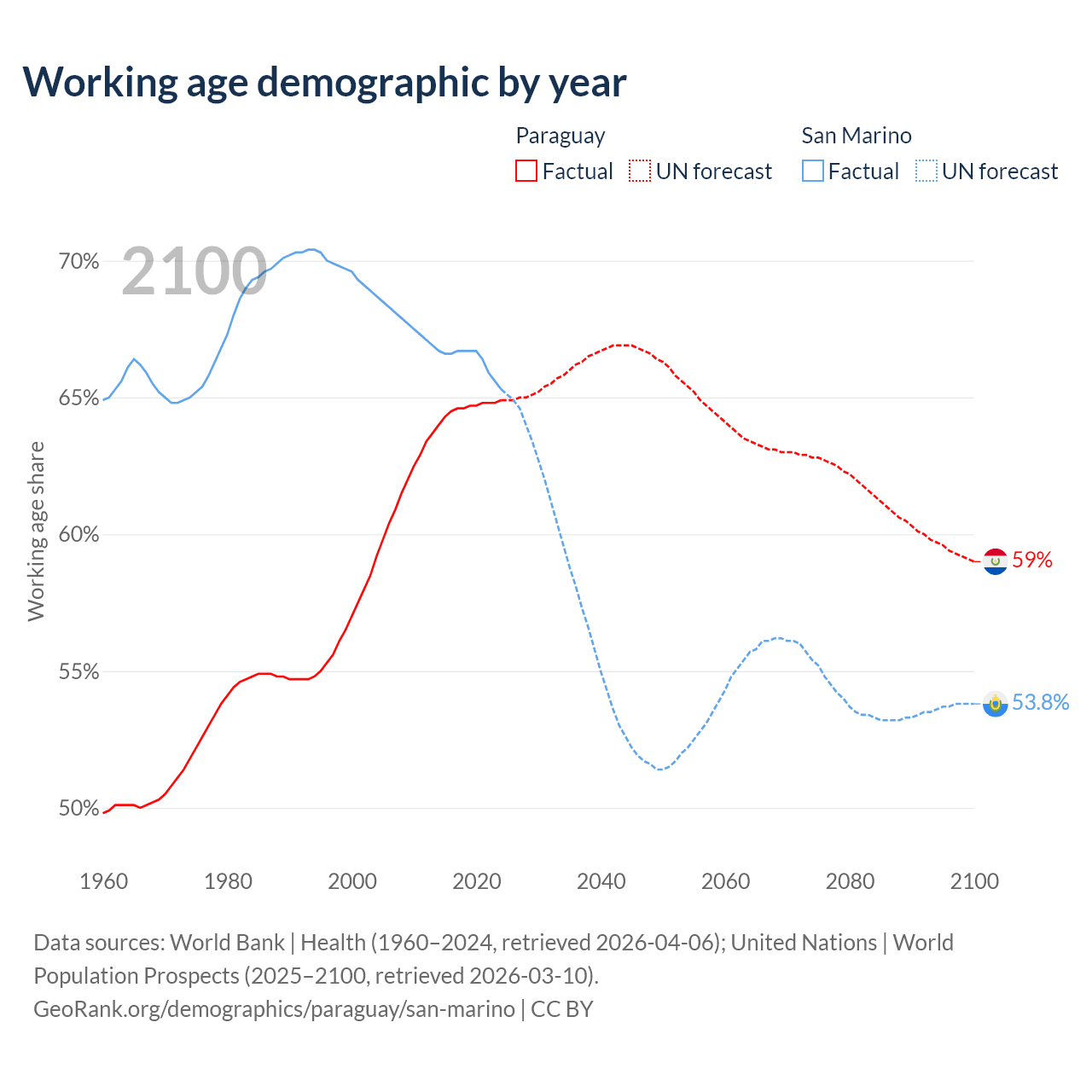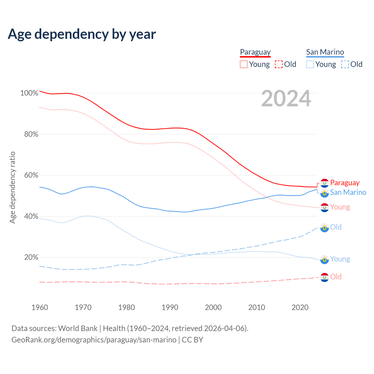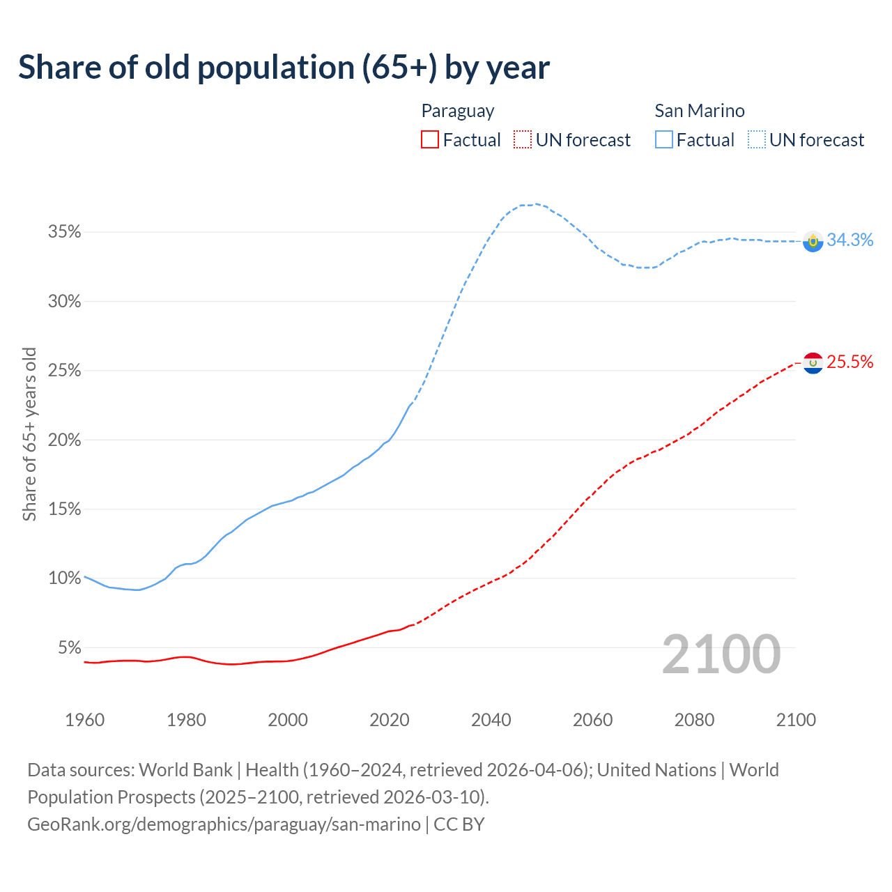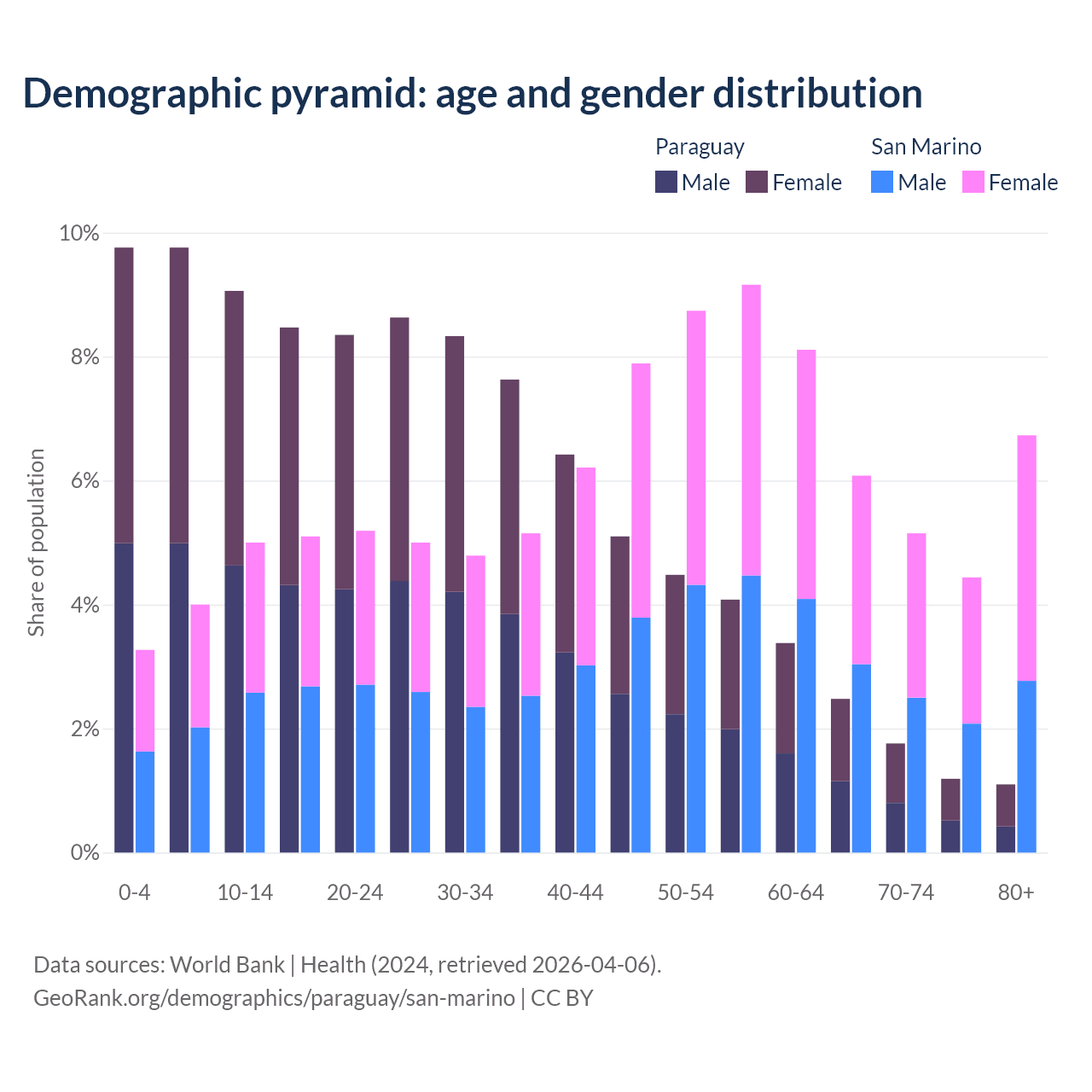 - The share of old-age demographic (65+) in Paraguay is 6.54% vs 22.4% in San Marino.