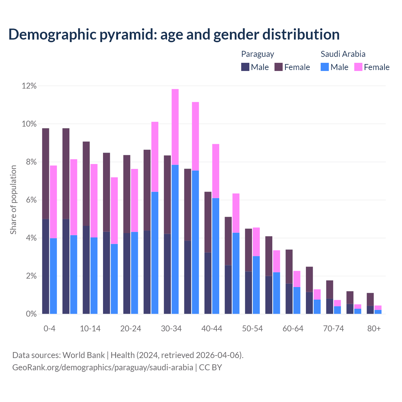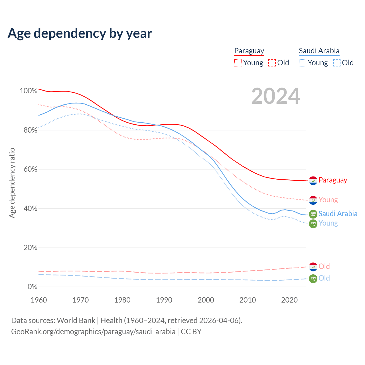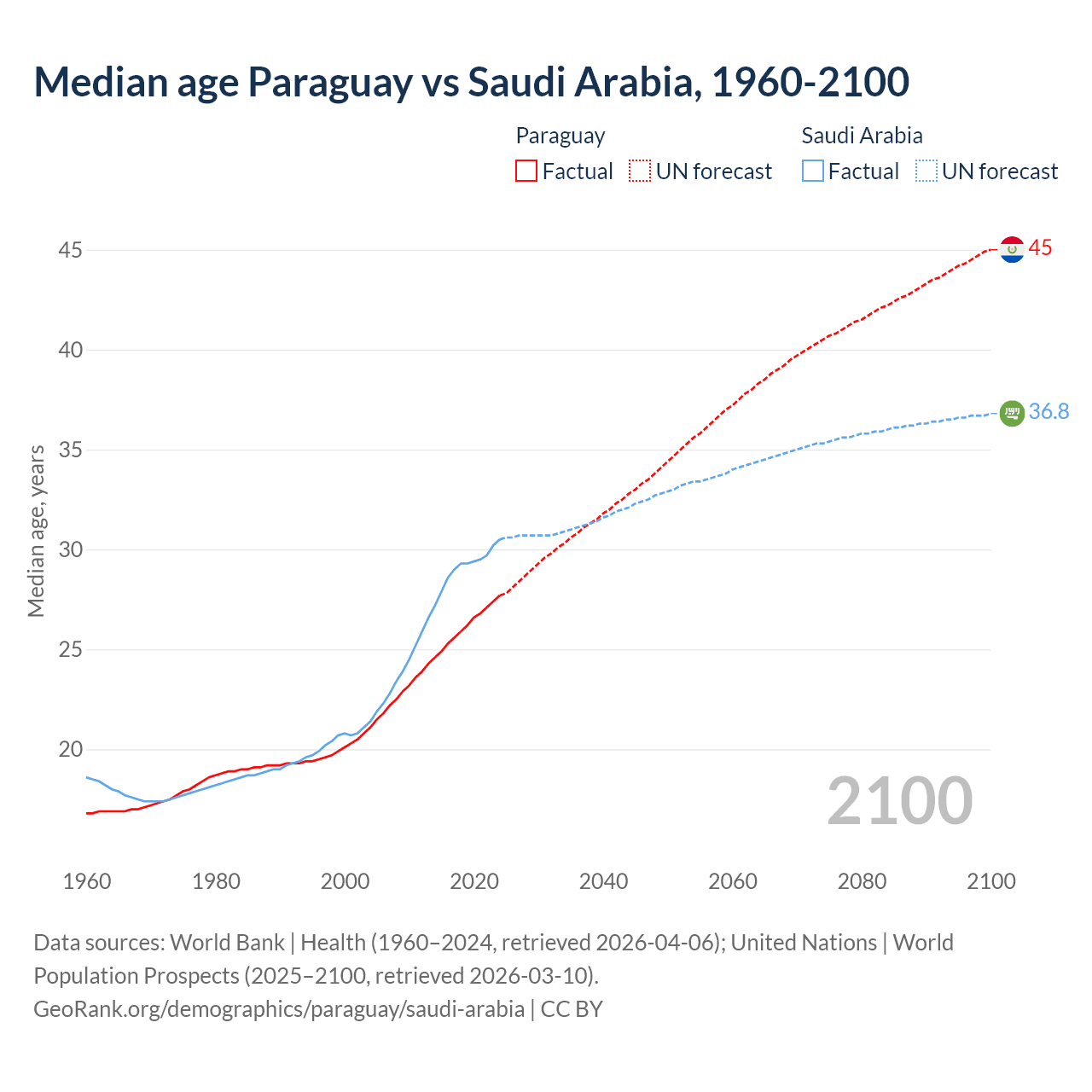 - Paraguay is ranked 118/196 by median age (oldest to youngest) vs 98/196 for Saudi Arabia.