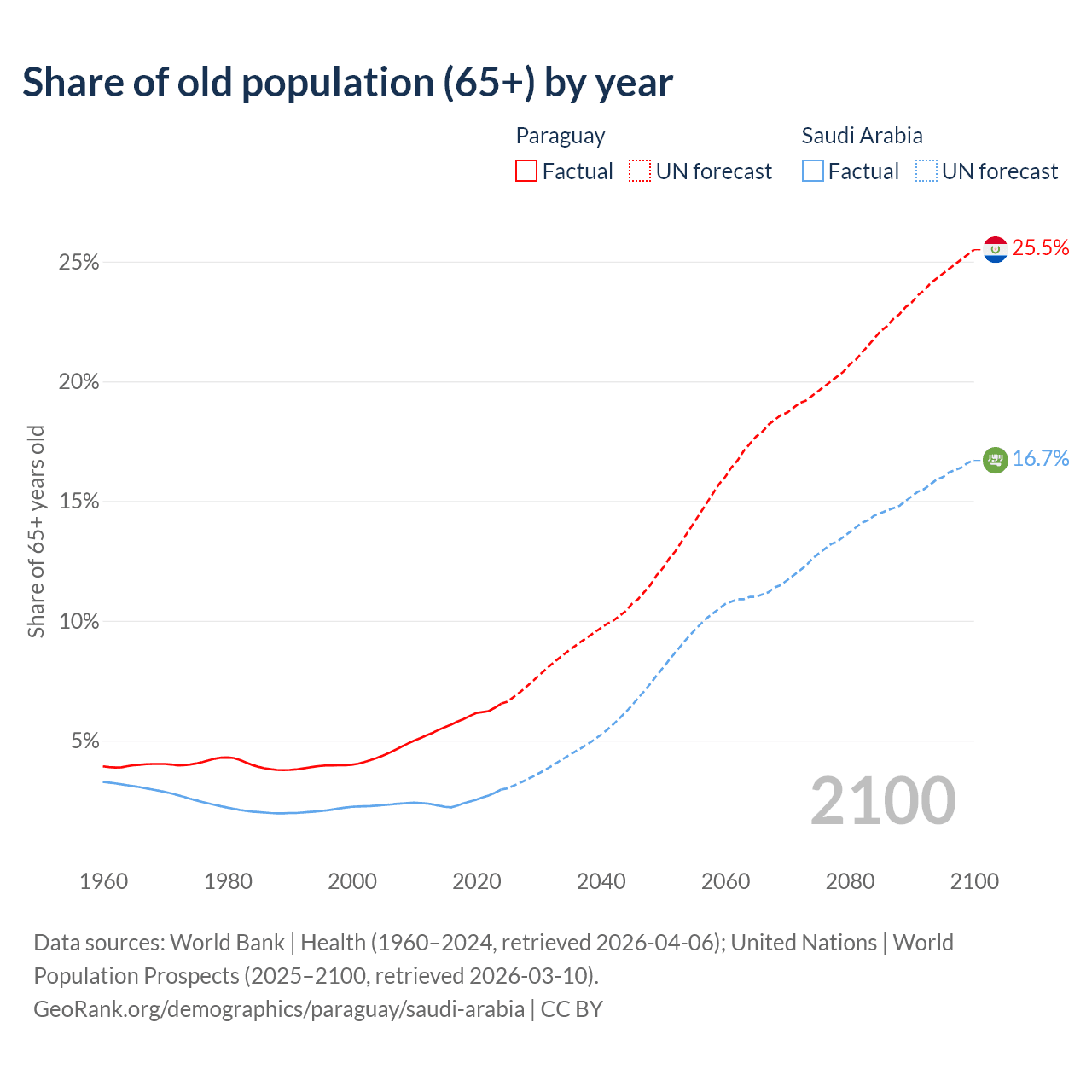 The share of older people aged 65 and over is 6.54% in Paraguay and 2.95% in Saudi Arabia. Life expectancy in Paraguay compared to Saudi Arabia .